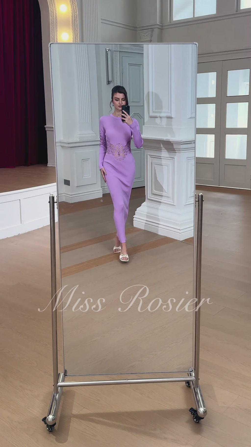 فستان ماكسي من Amanda، مصنوع من نسيج محبوك منسوج، مزين بألواح من الدانتيل الأرجواني.