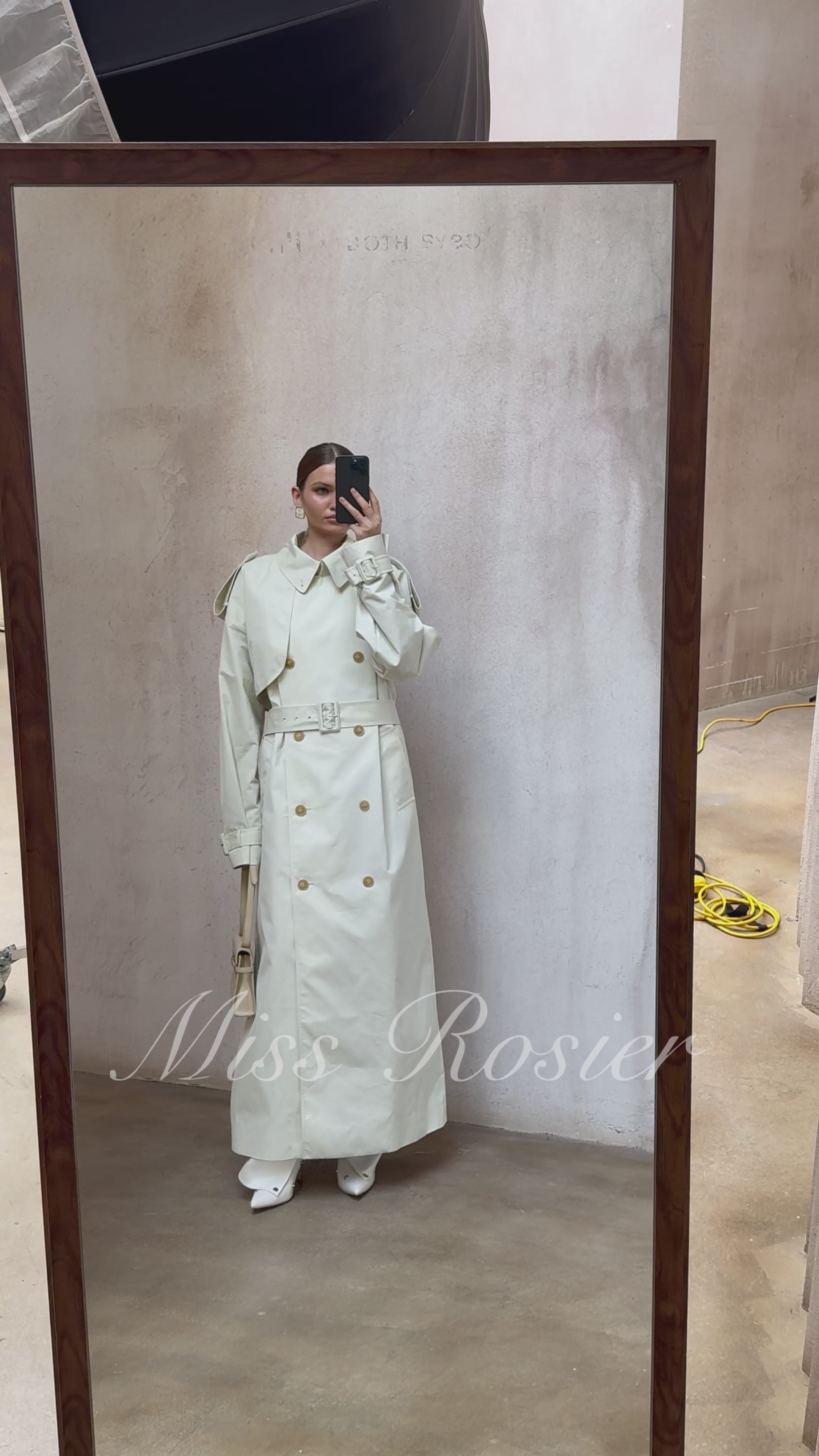 معطف ترينش طويل أبيض مزدوج الصدر من بروير.