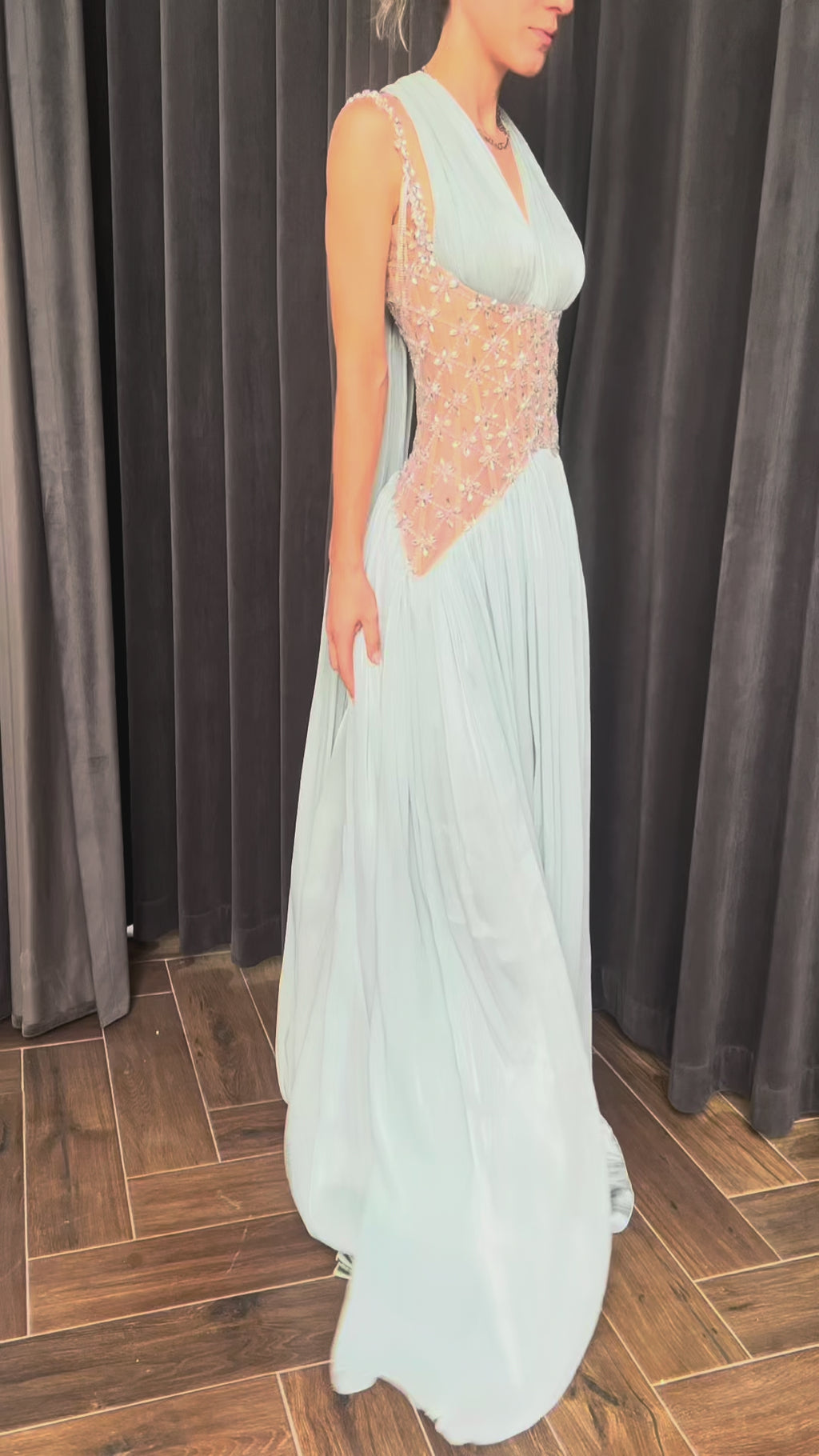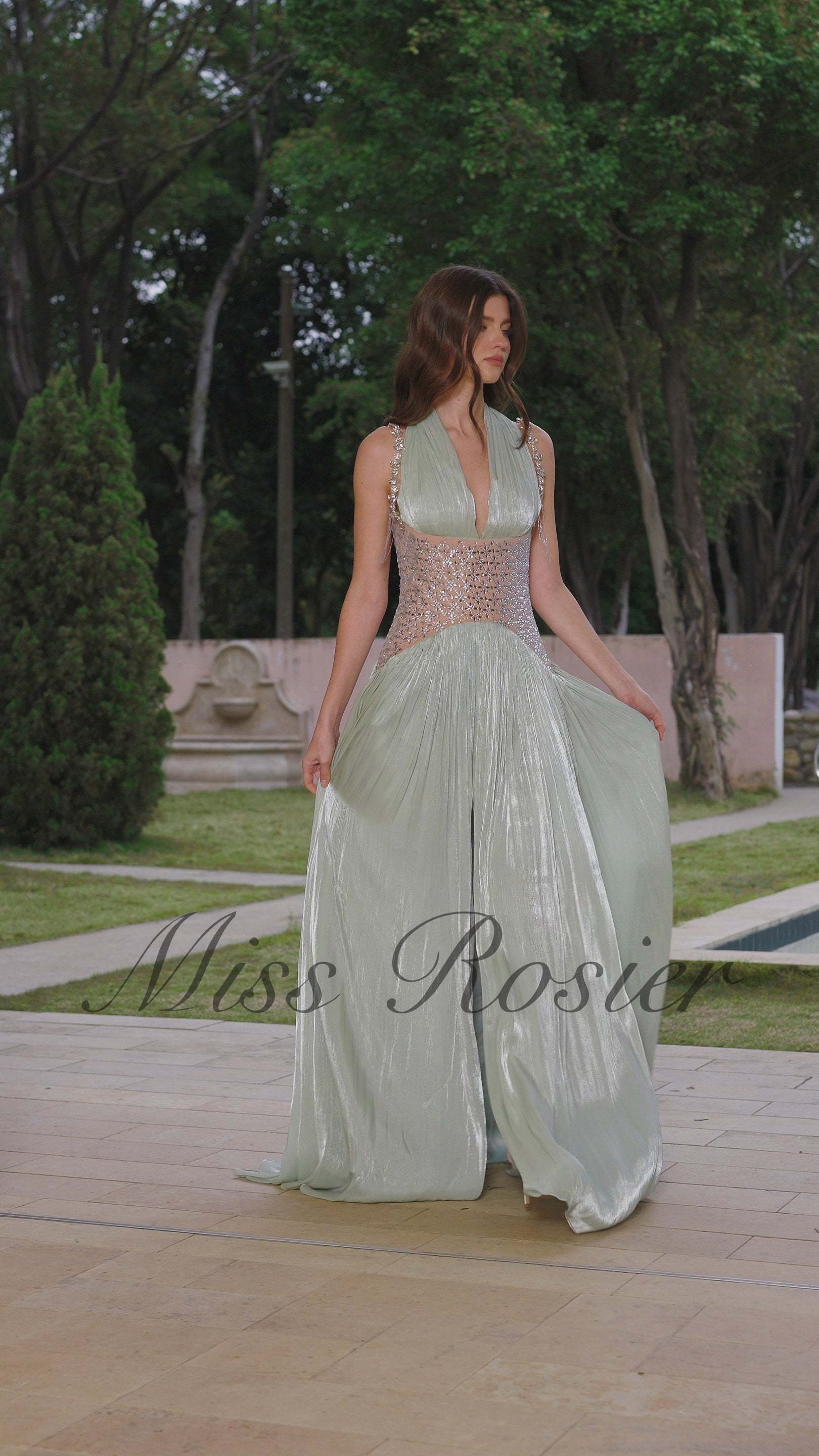 فستان ماكسي أخضر من Gwenaëlle مزين بألواح من أحجار الراين