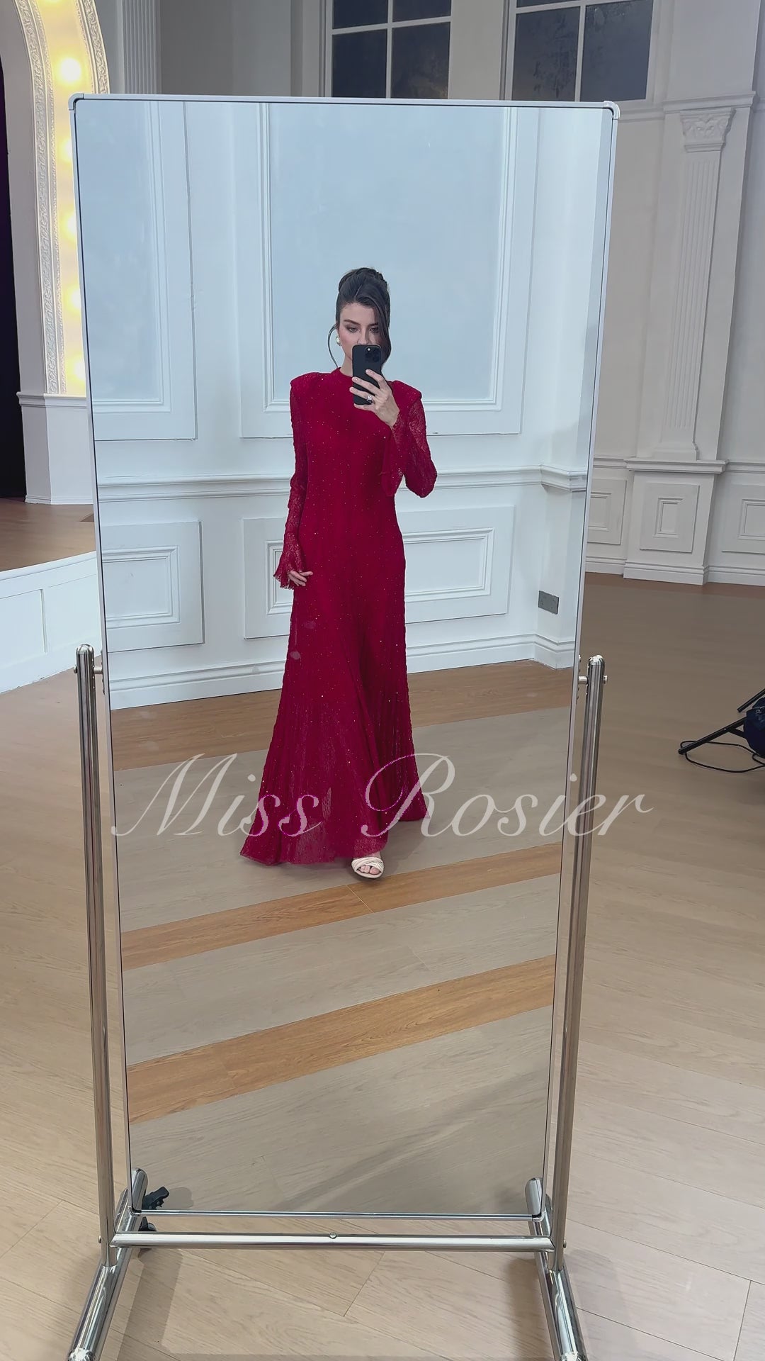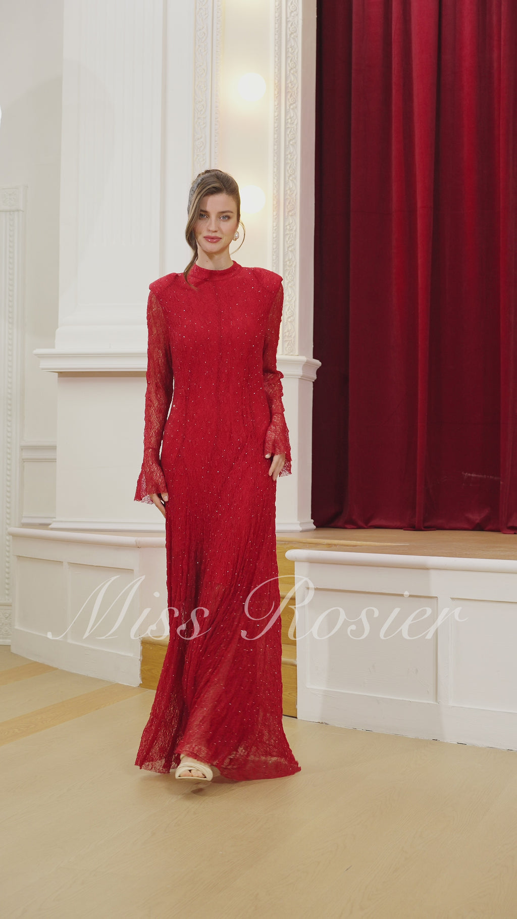 فستان ماكسي من الدانتيل بتصميم جيبور أحمر مزين بالترتر من Justyna