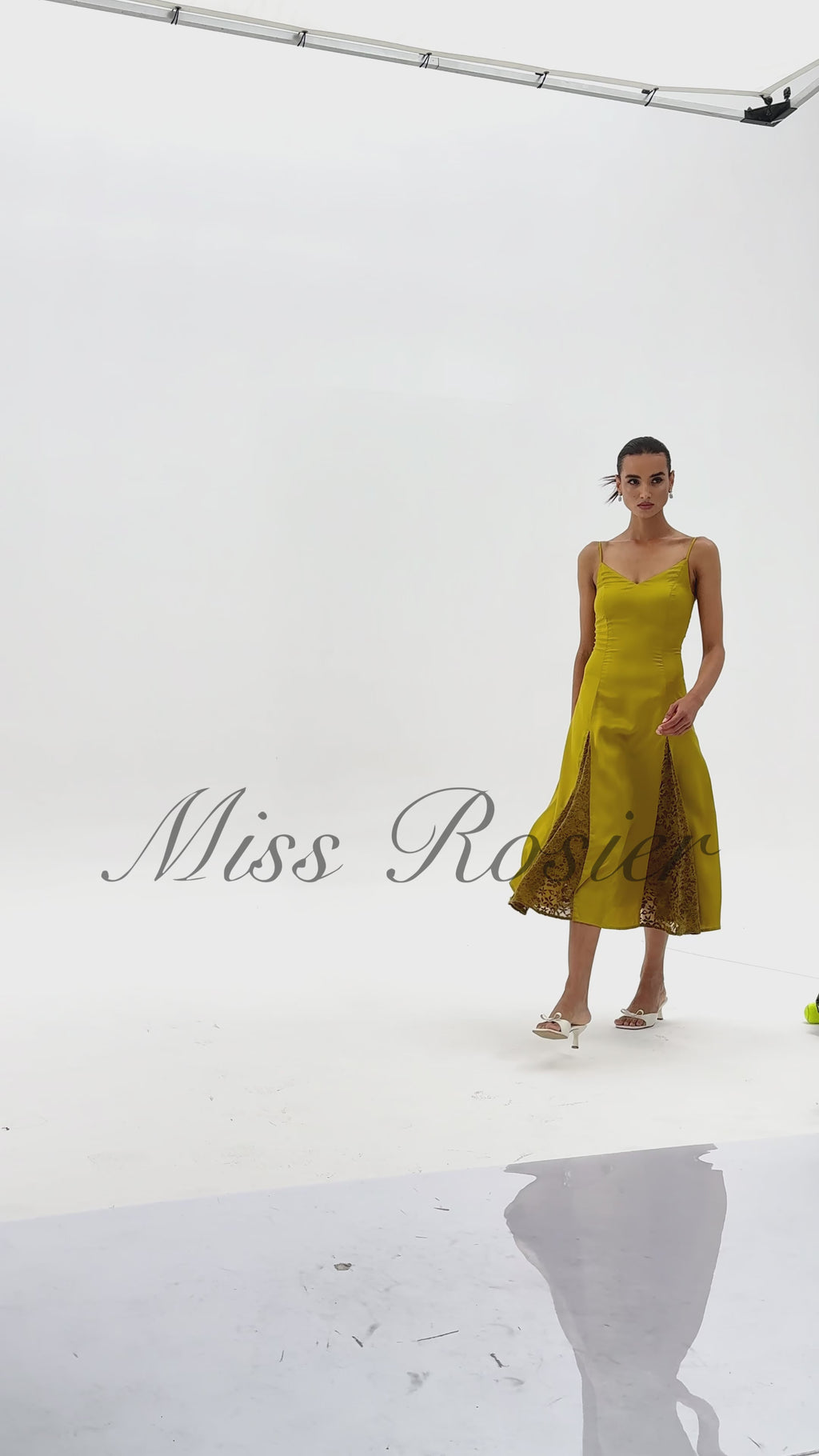فستان صيفي متوسط الطول من الساتان المخملي المزين بالدانتيل من لويز جرين