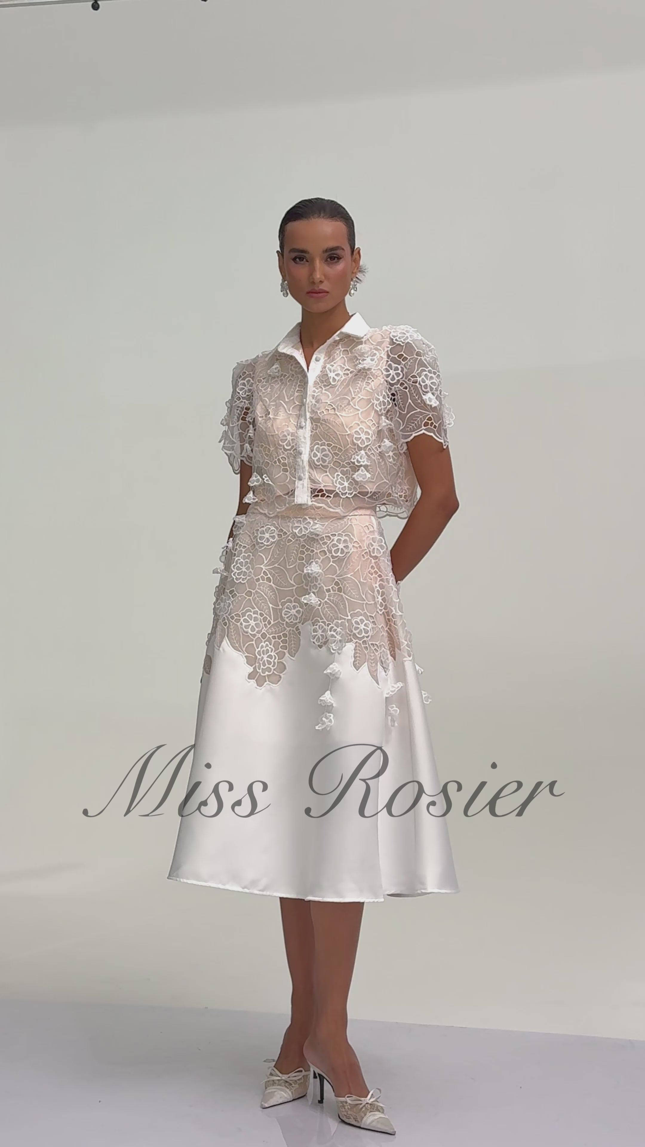 طقم أنماريا من قمة وتنورة من الدانتيل المنسوج باللون الأبيض