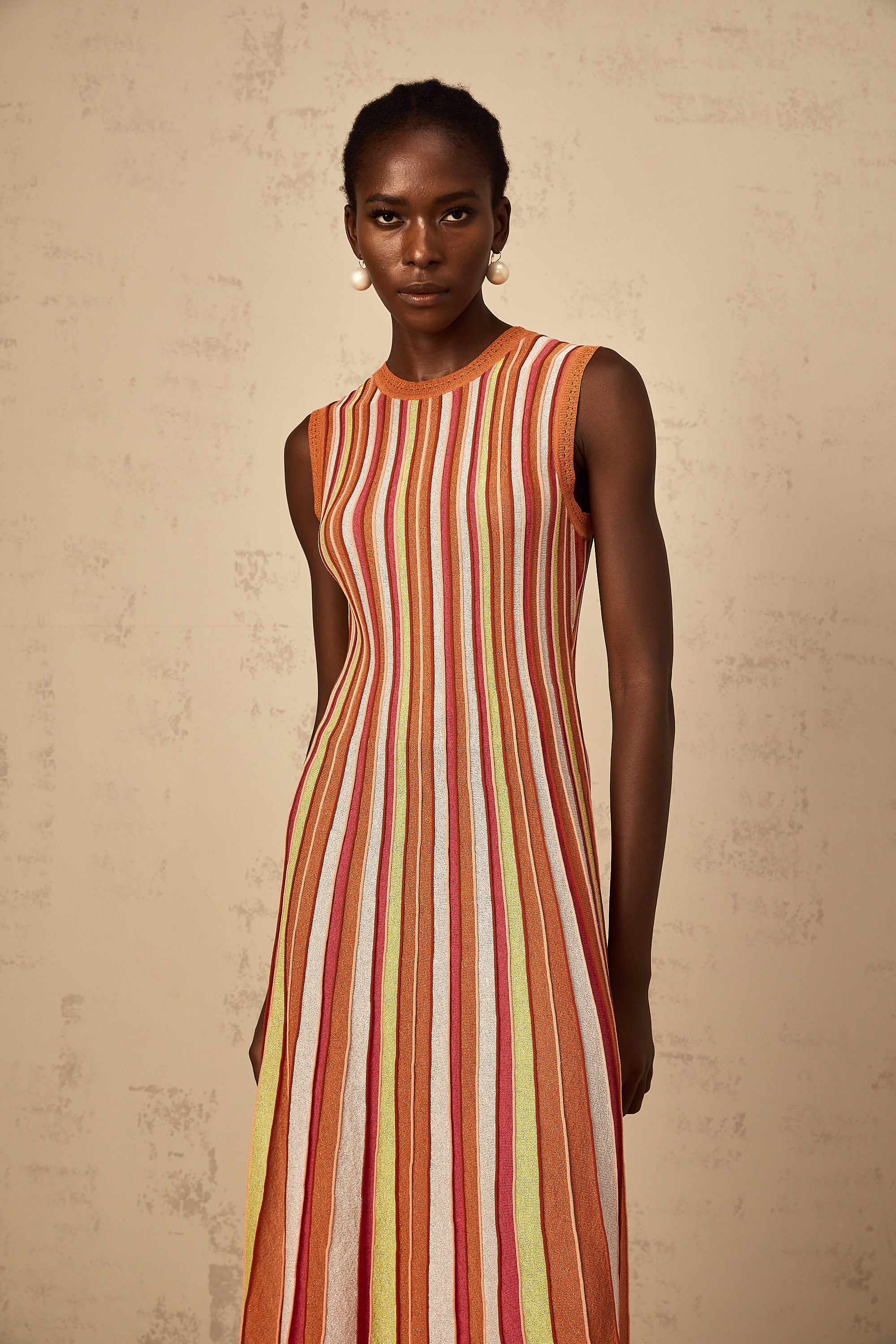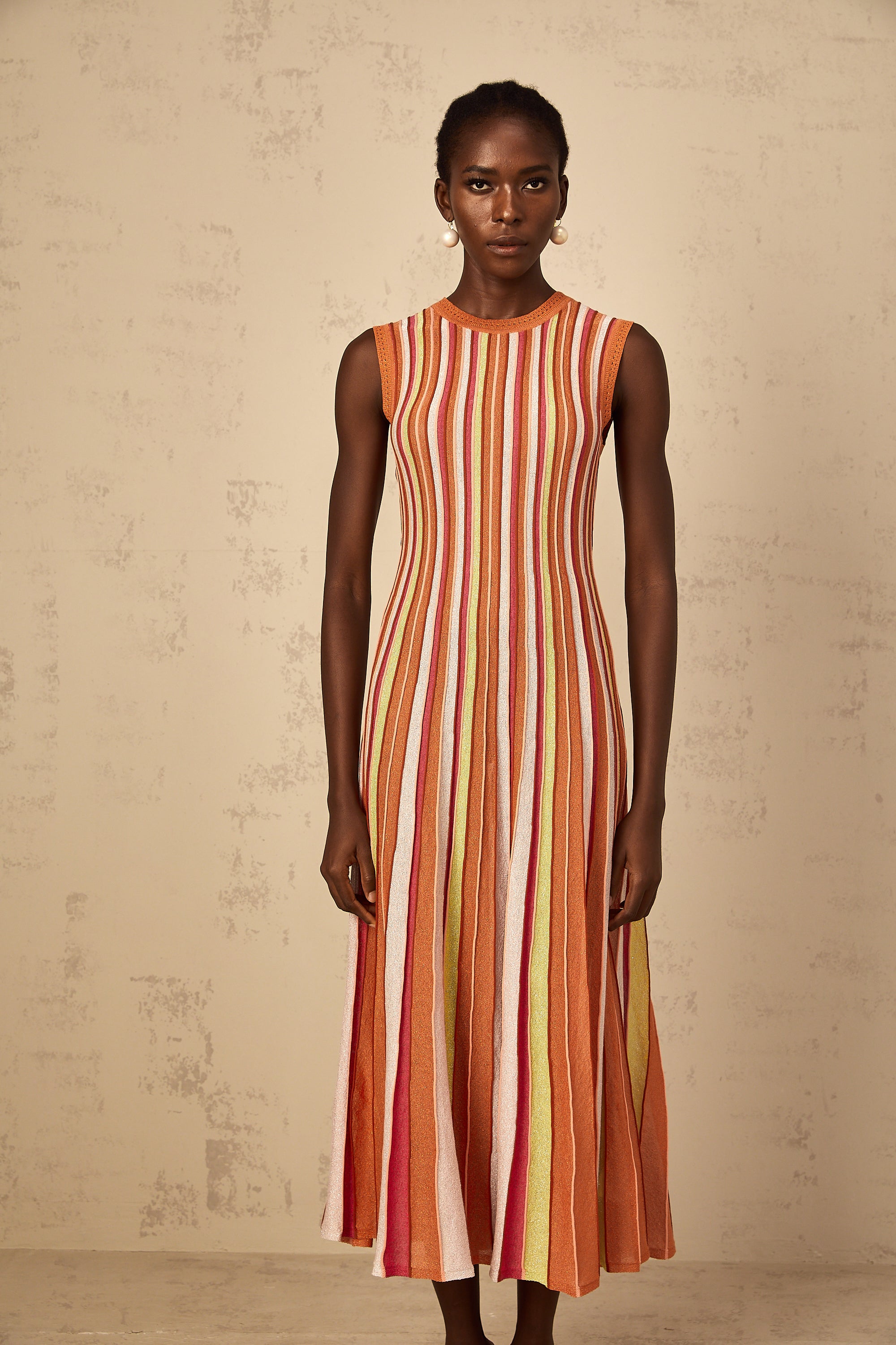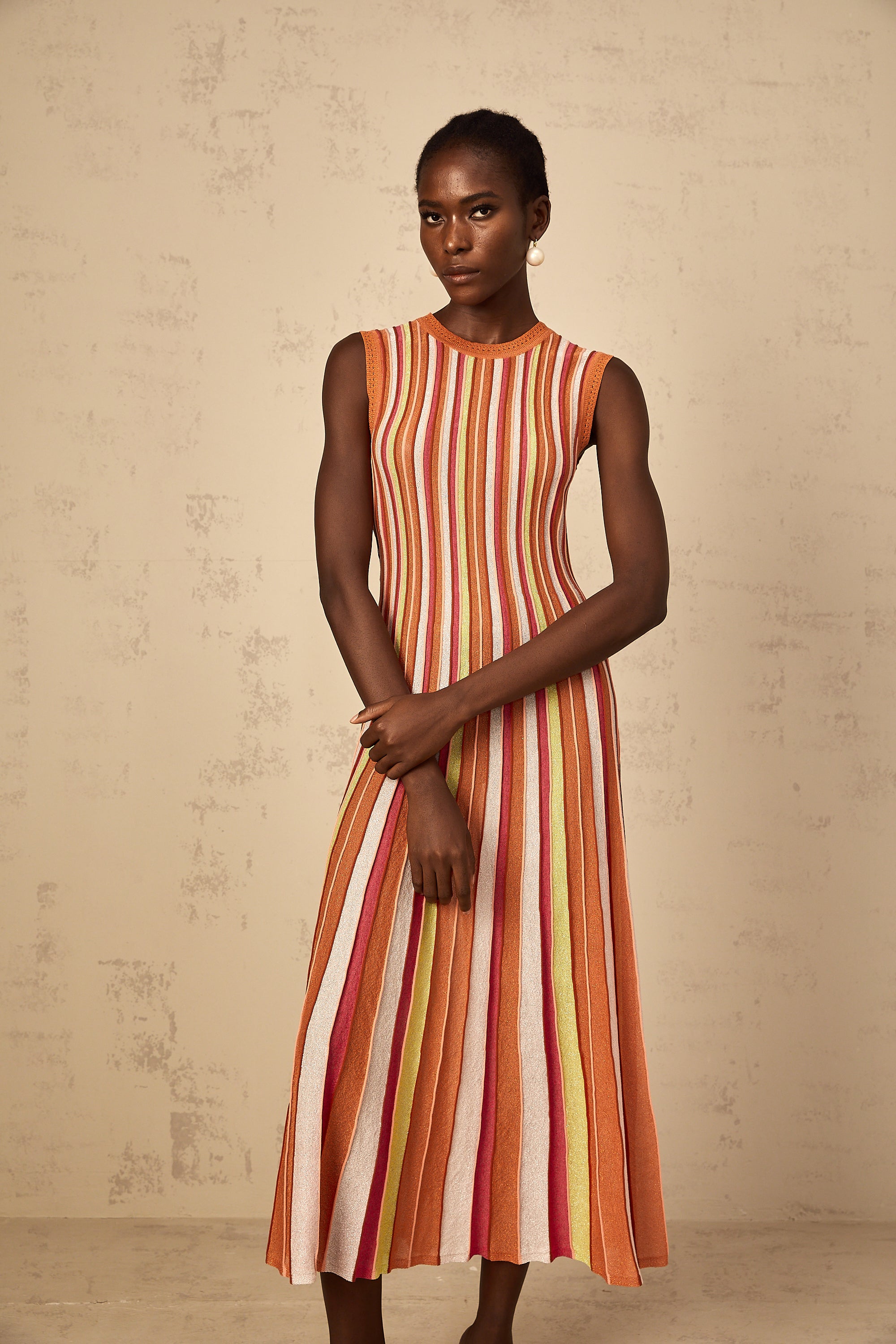 فستان أبريانا برتقالي متوسط الطول محبوك بخطوط عمودية
