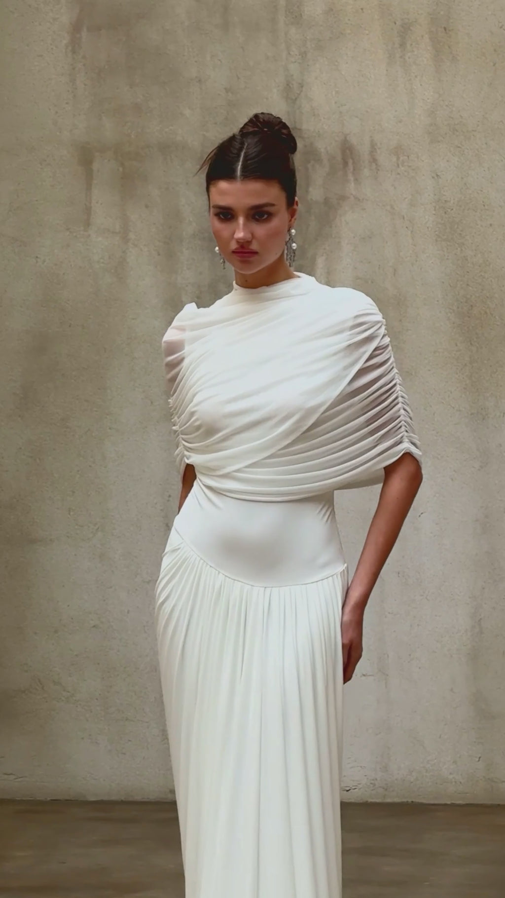 فستان كاثرين ماكسي مطوي غير متماثل باللون الأبيض