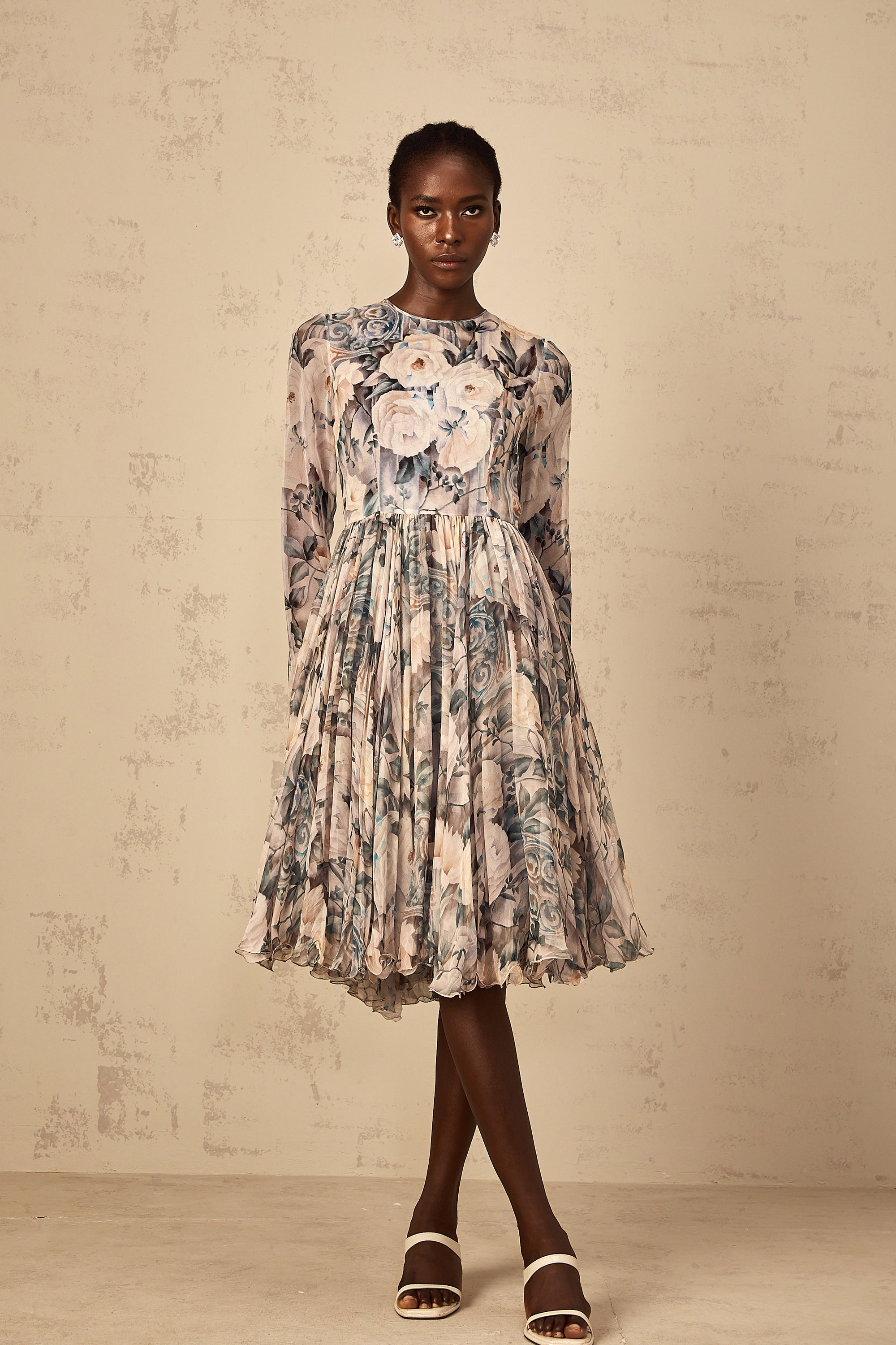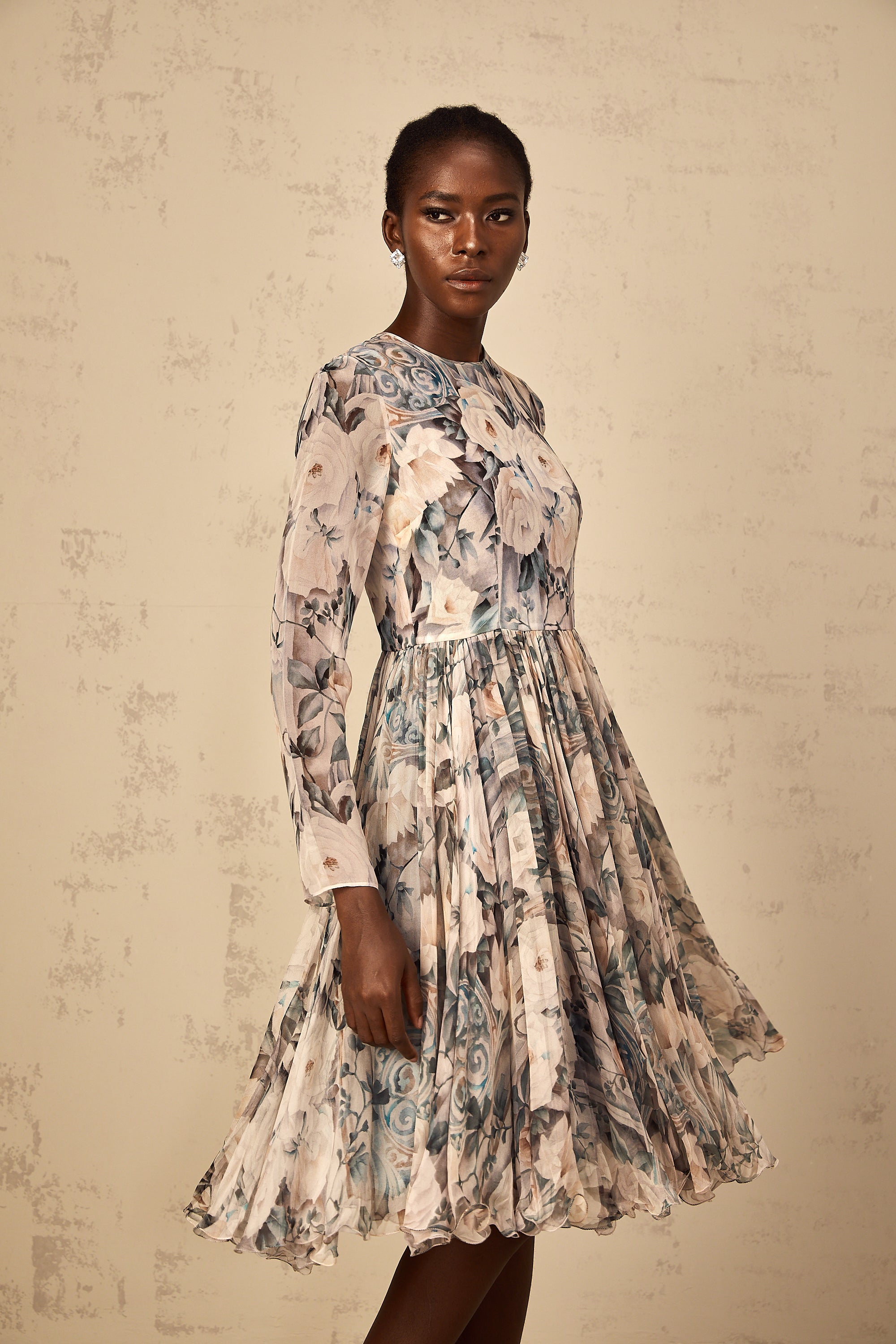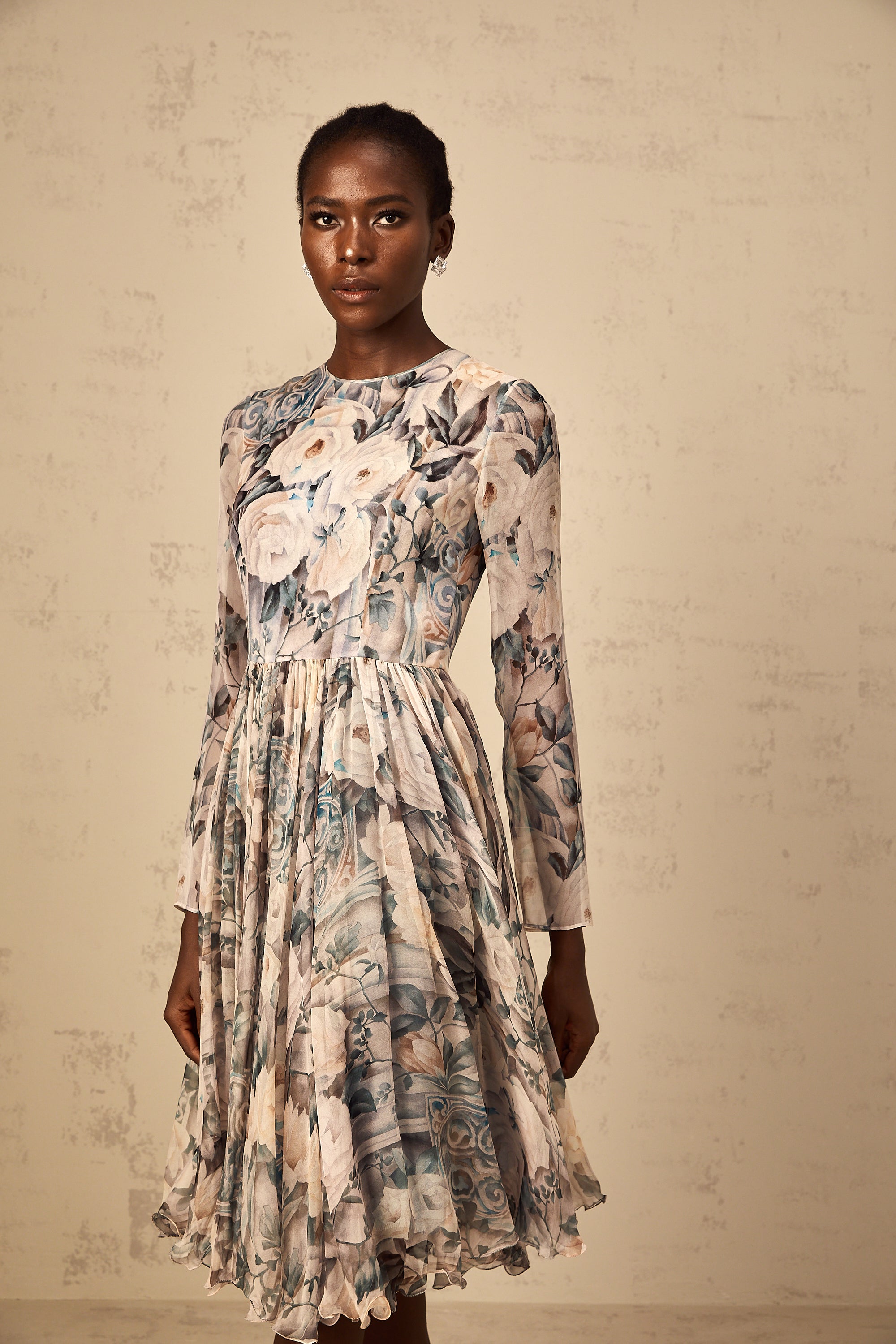فستان ميلاني متوسط الطول من الشيفون بطبعة زهور
