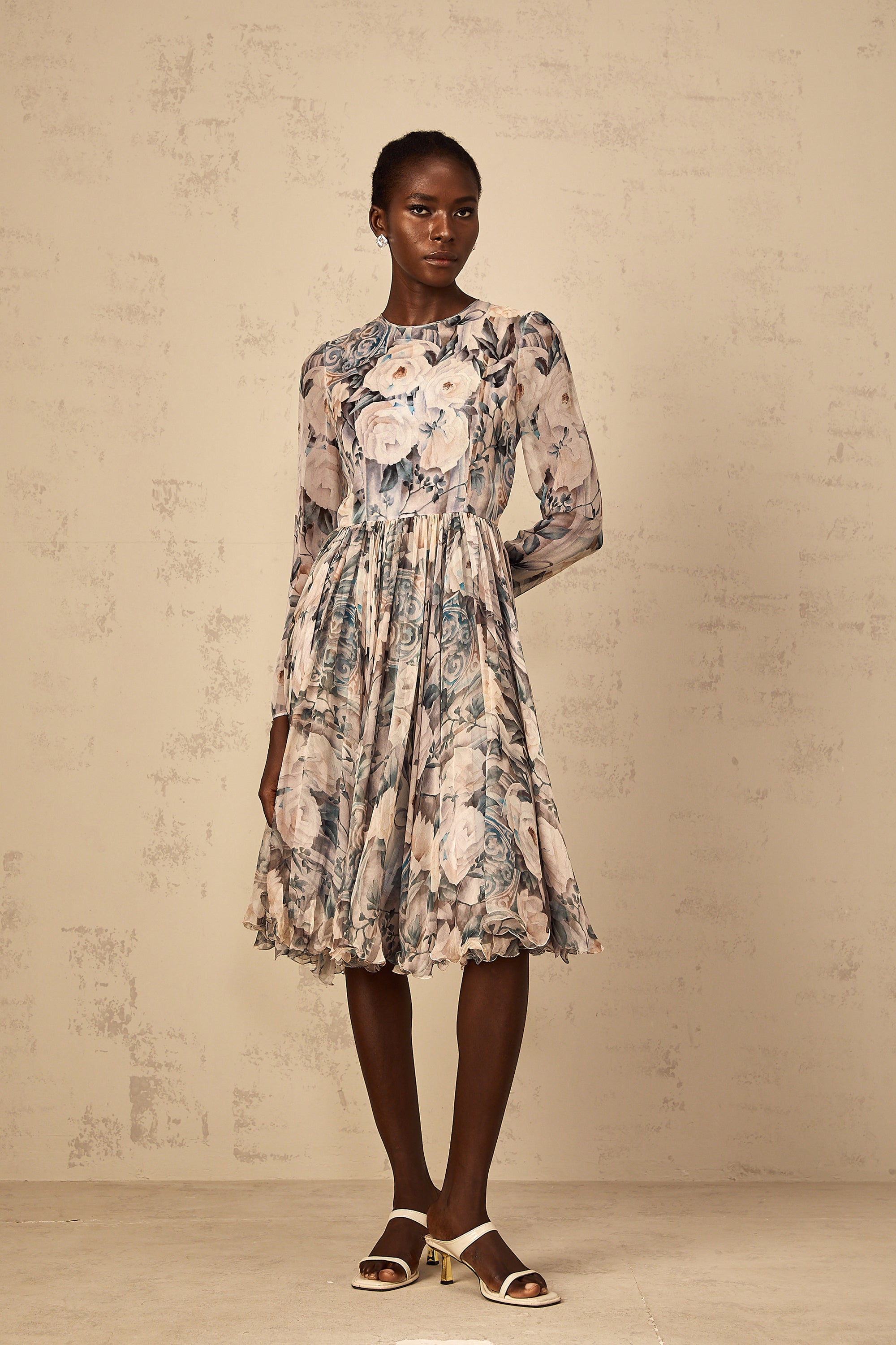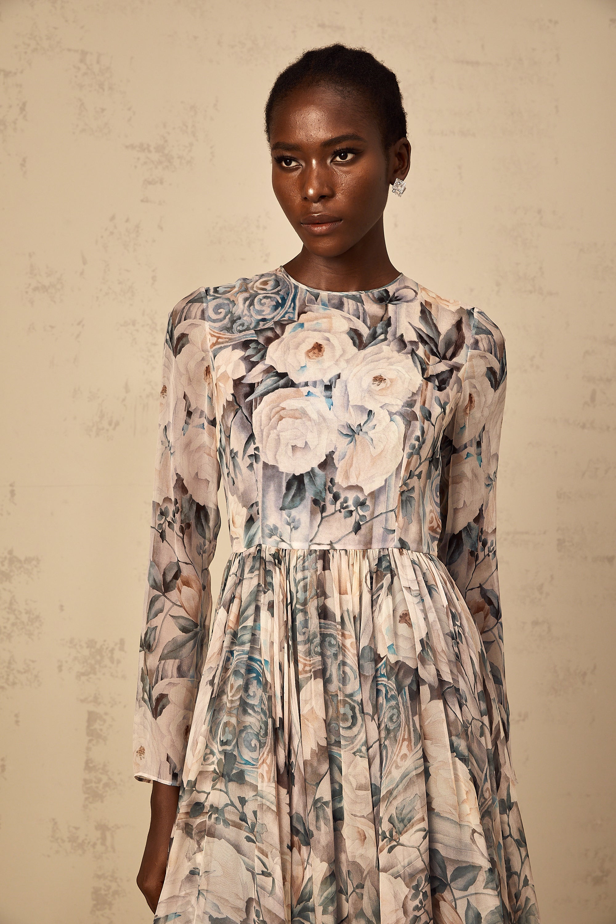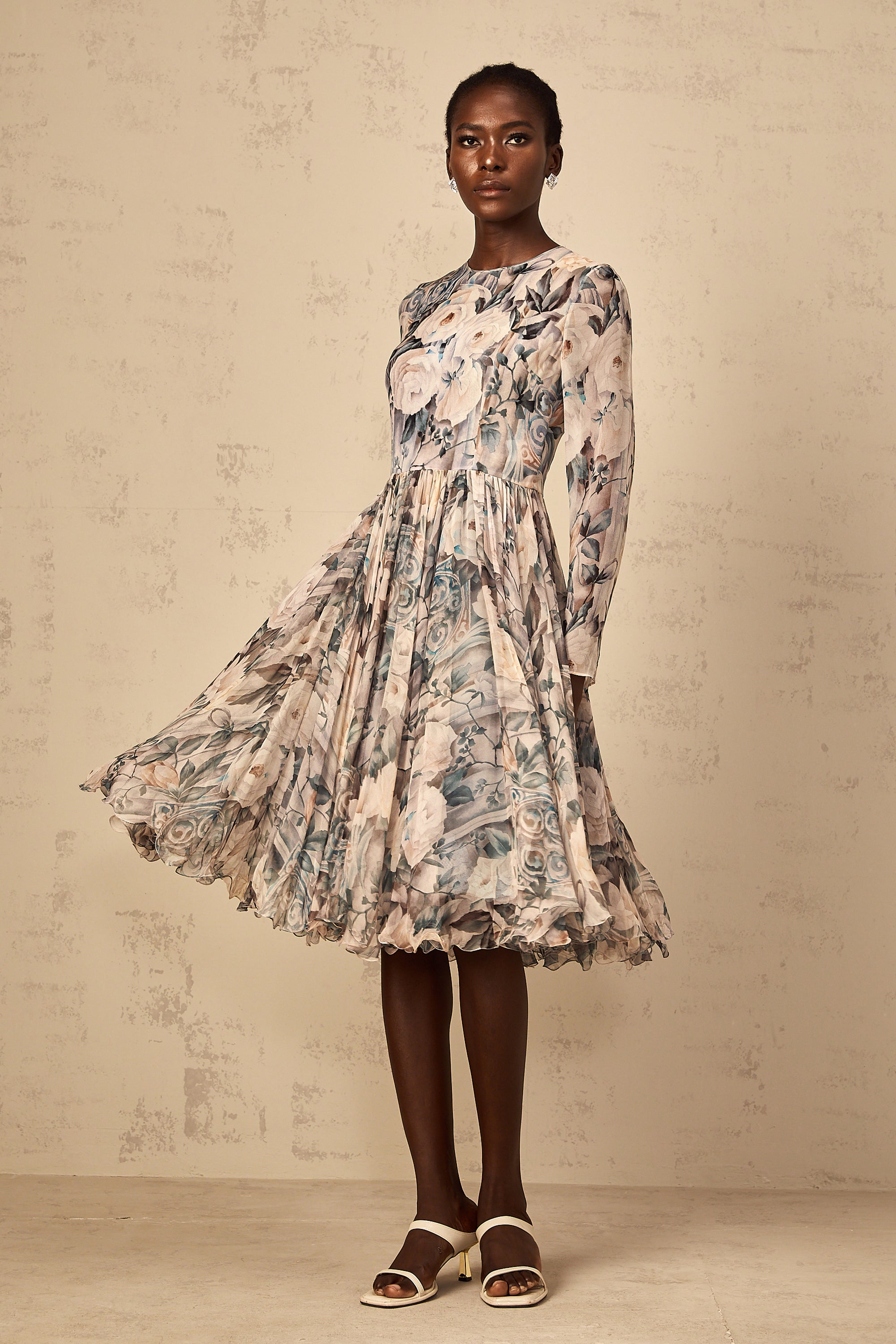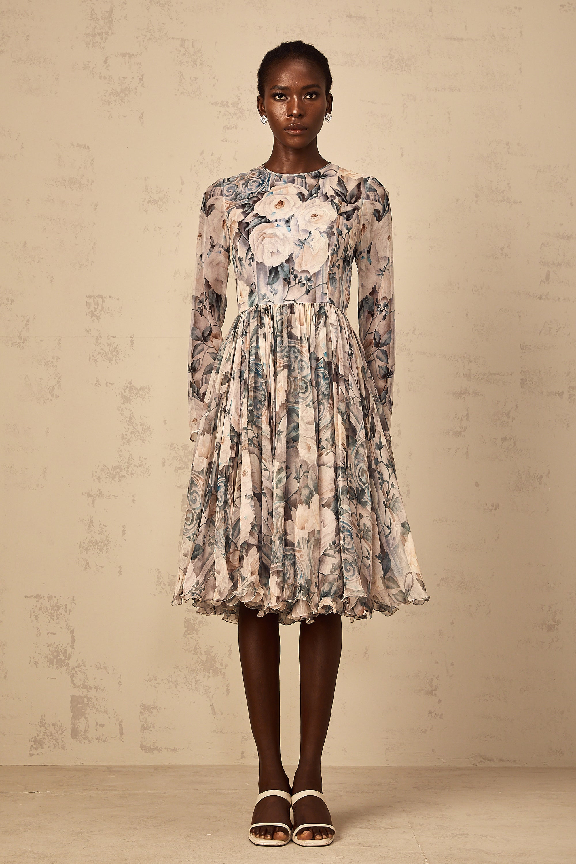 فستان ميلاني متوسط الطول من الشيفون بطبعة زهور