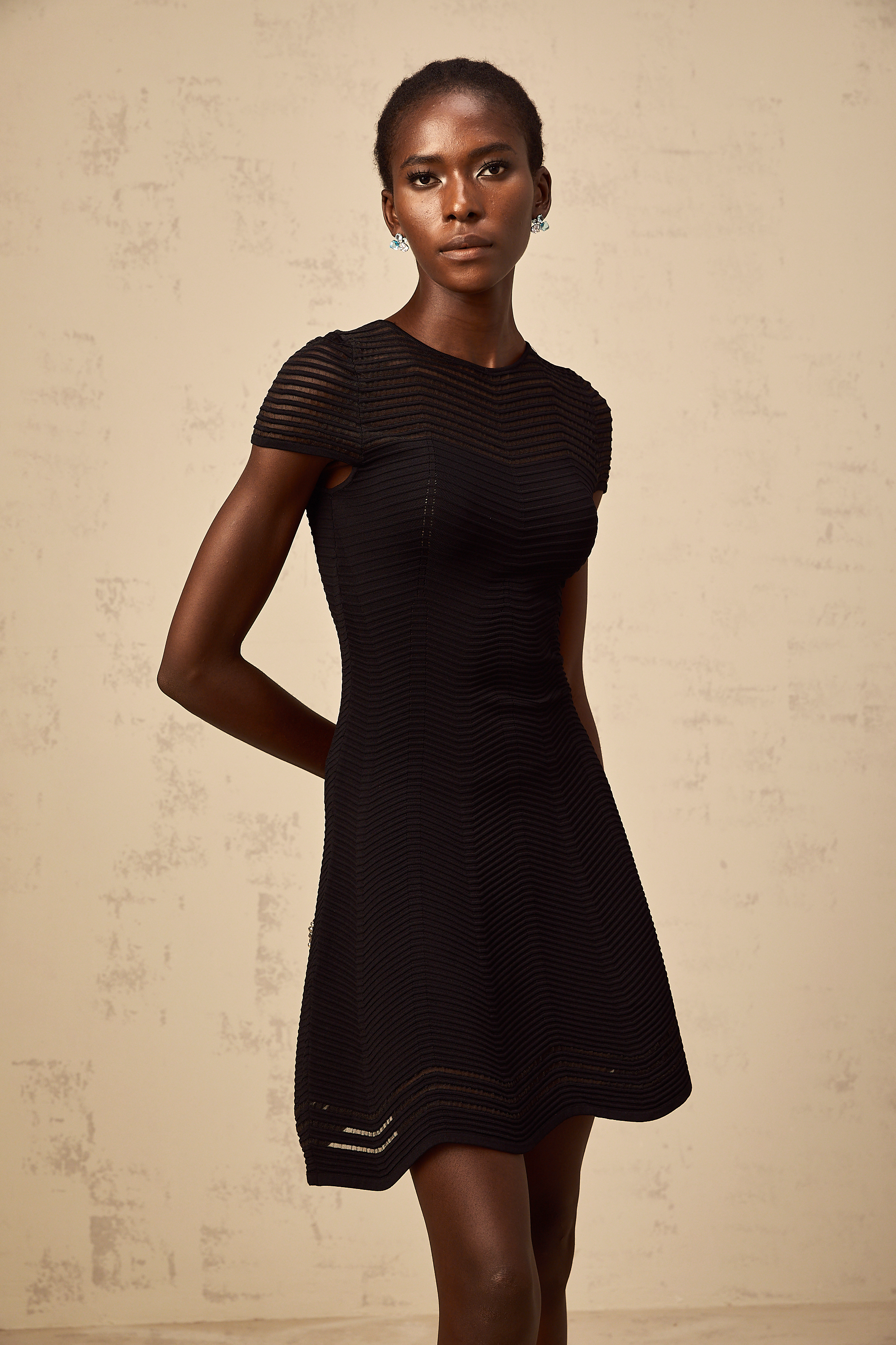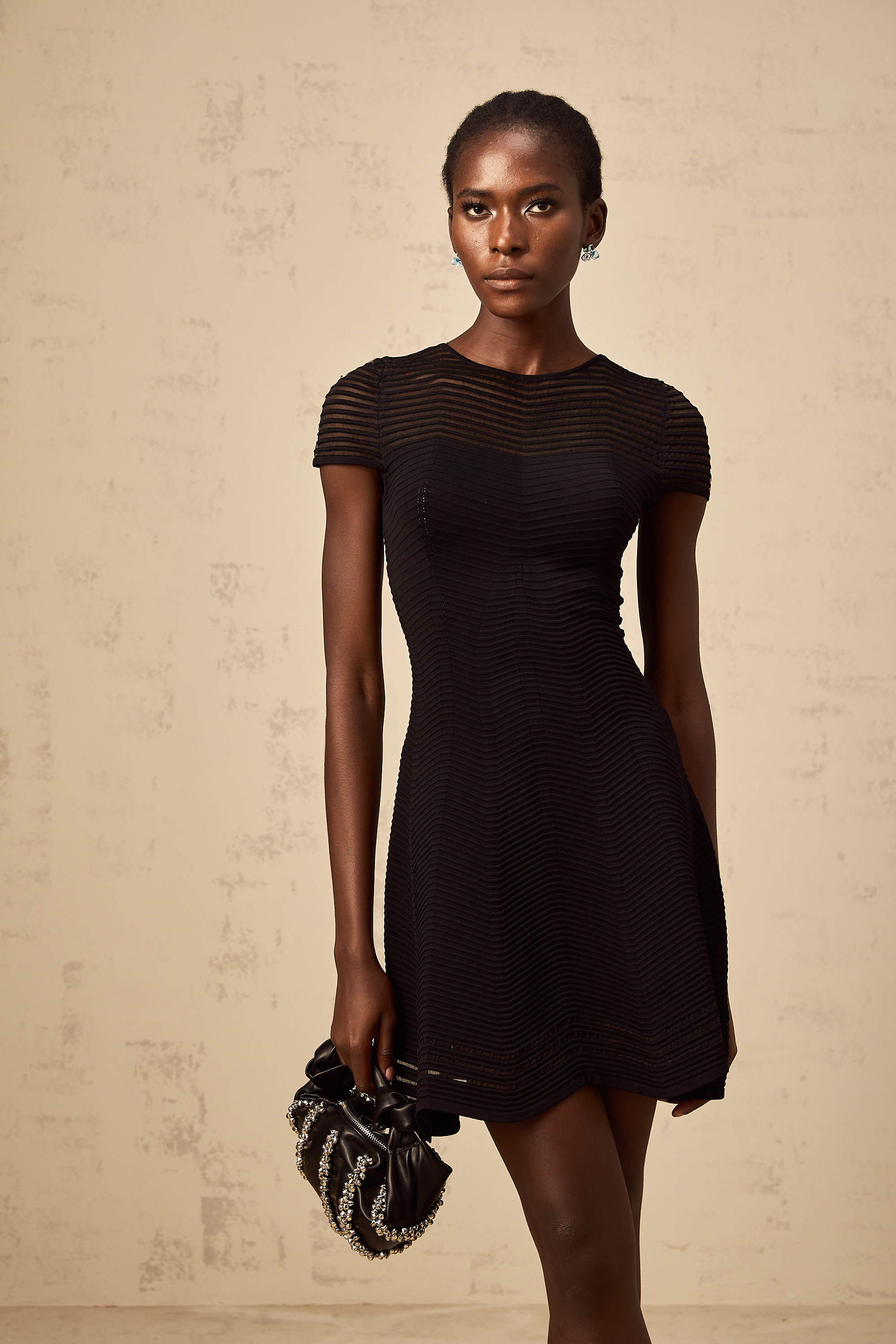 • • طول الموديل 1.77 متر، وترتدي المقاس M