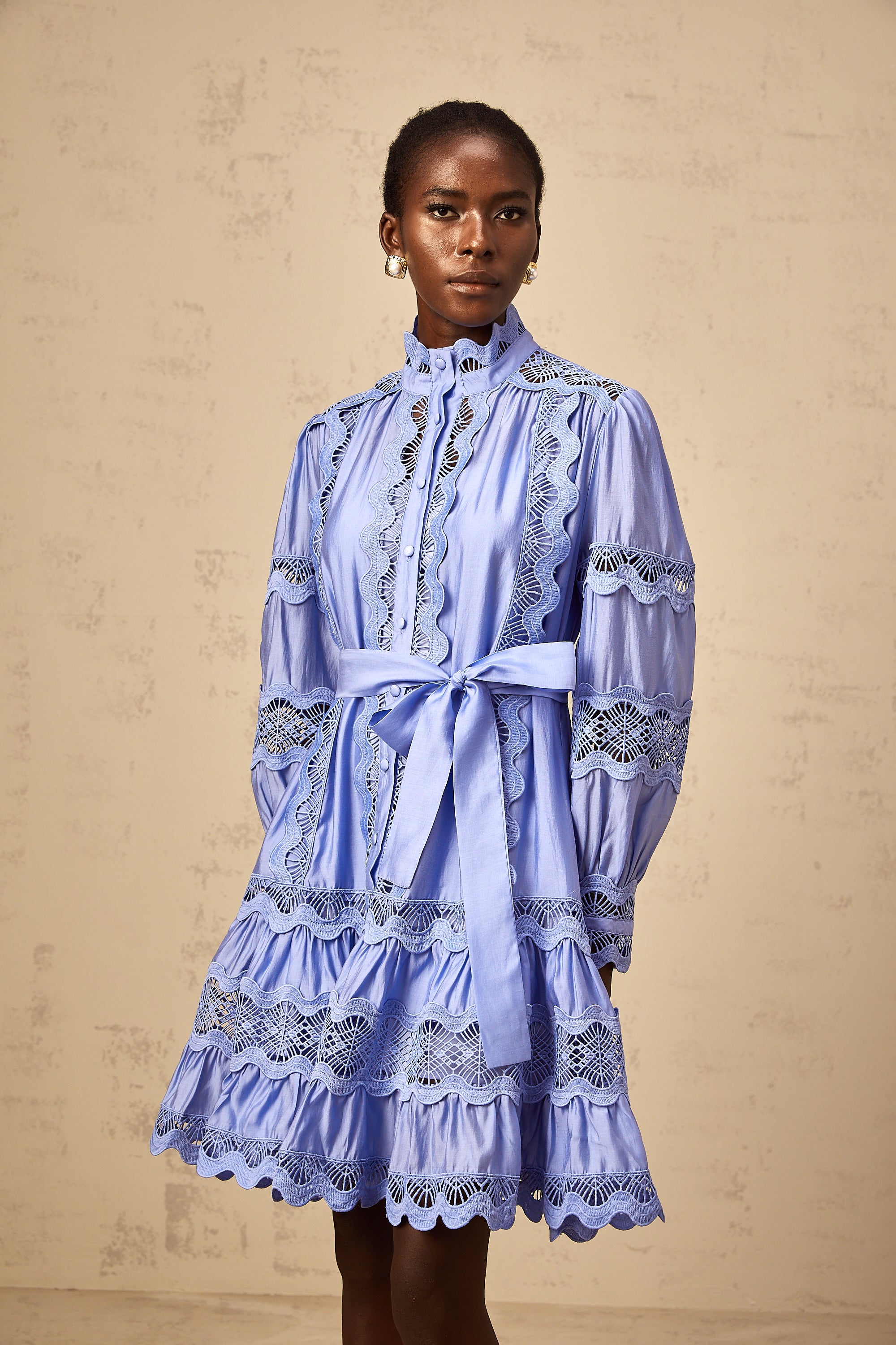 فستان قصير متعدد الطبقات من Poema باللون الأزرق، مطرز بزخارف مقطوعة