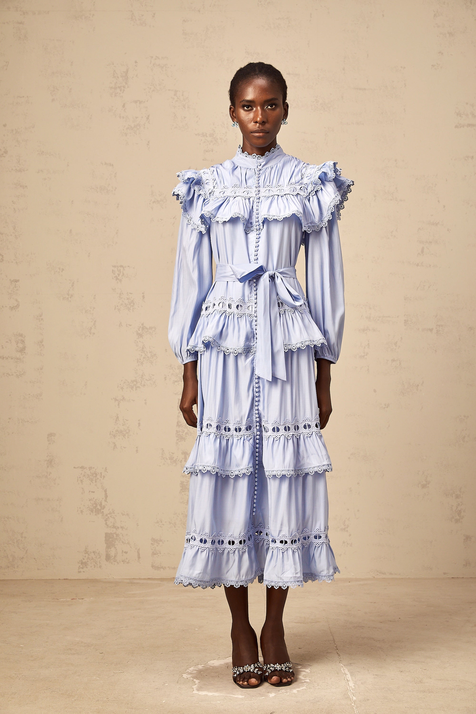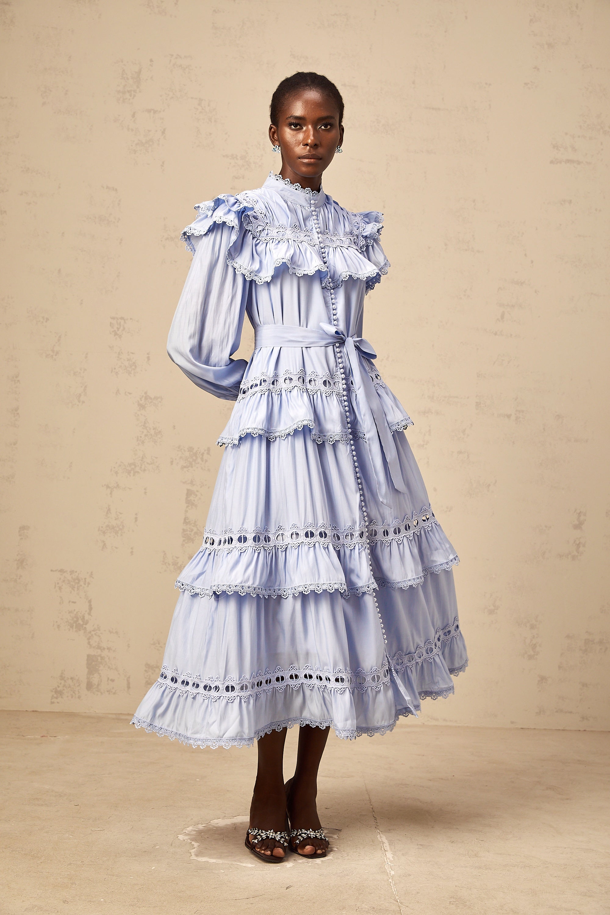 فستان أولينا متوسط ​​الطول باللون الأزرق مزين بزخارف من الدانتيل والزهور