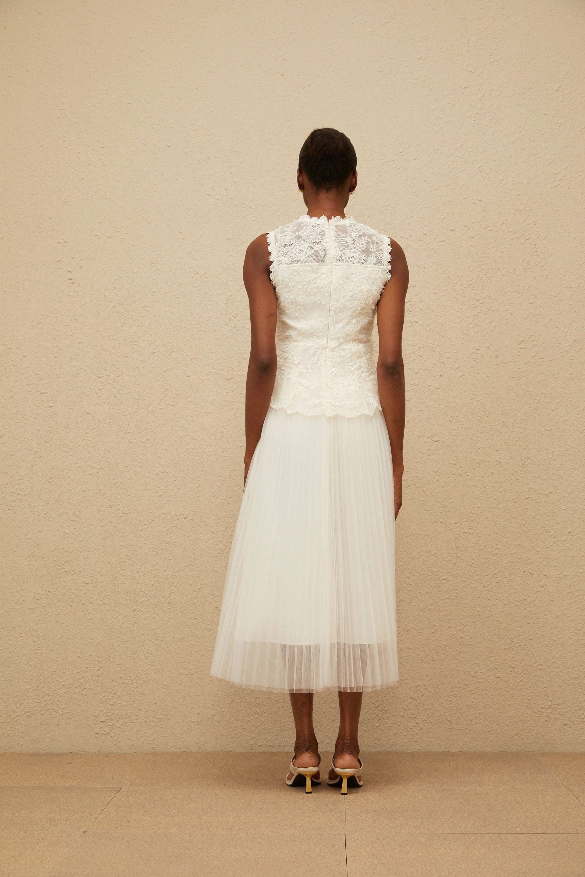 Juno Neutral Pleated Mesh Midi Dress