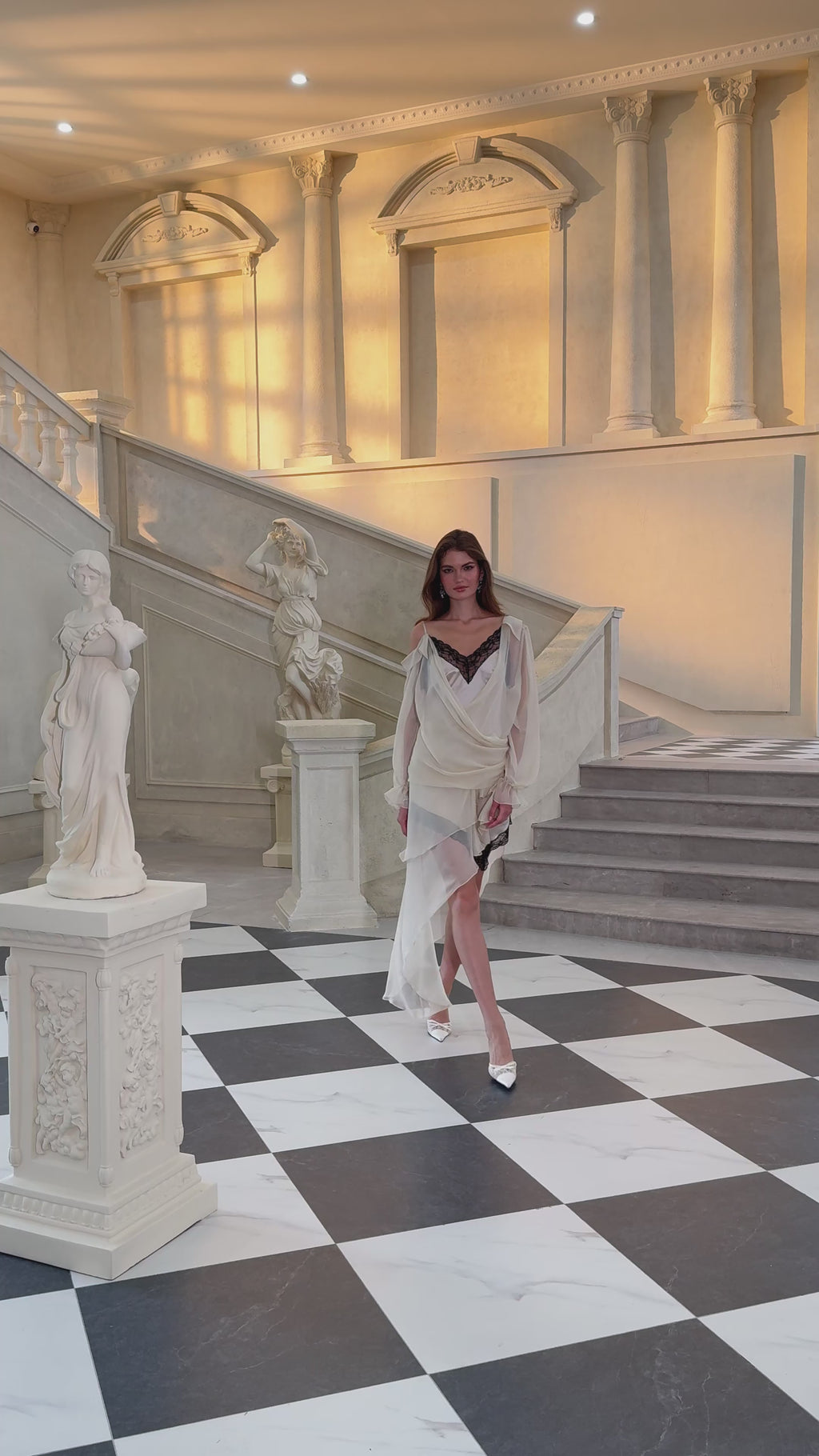 Armance – Neutrales, asymmetrisches Minikleid aus Tüll mit Bahnenmuster