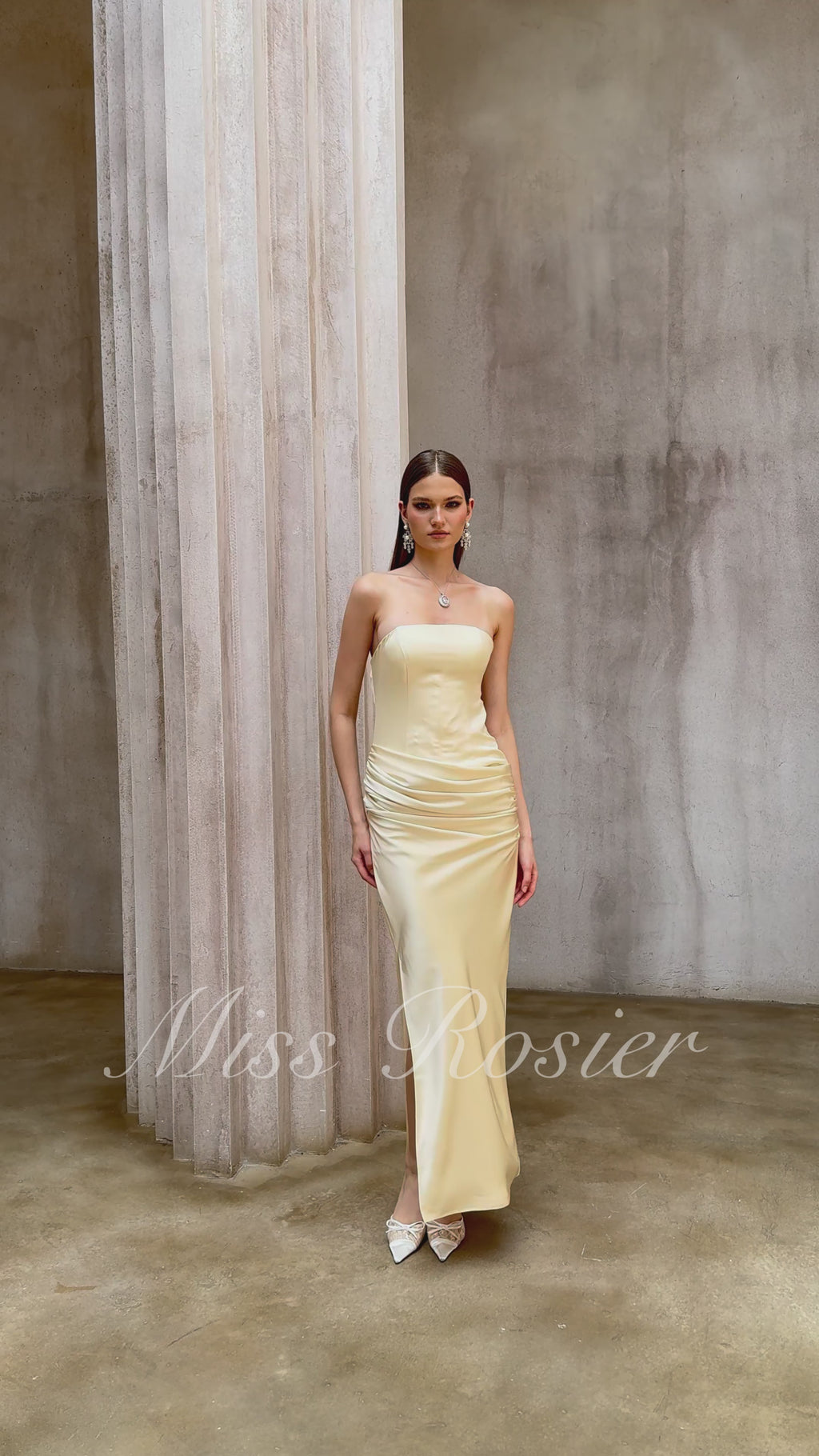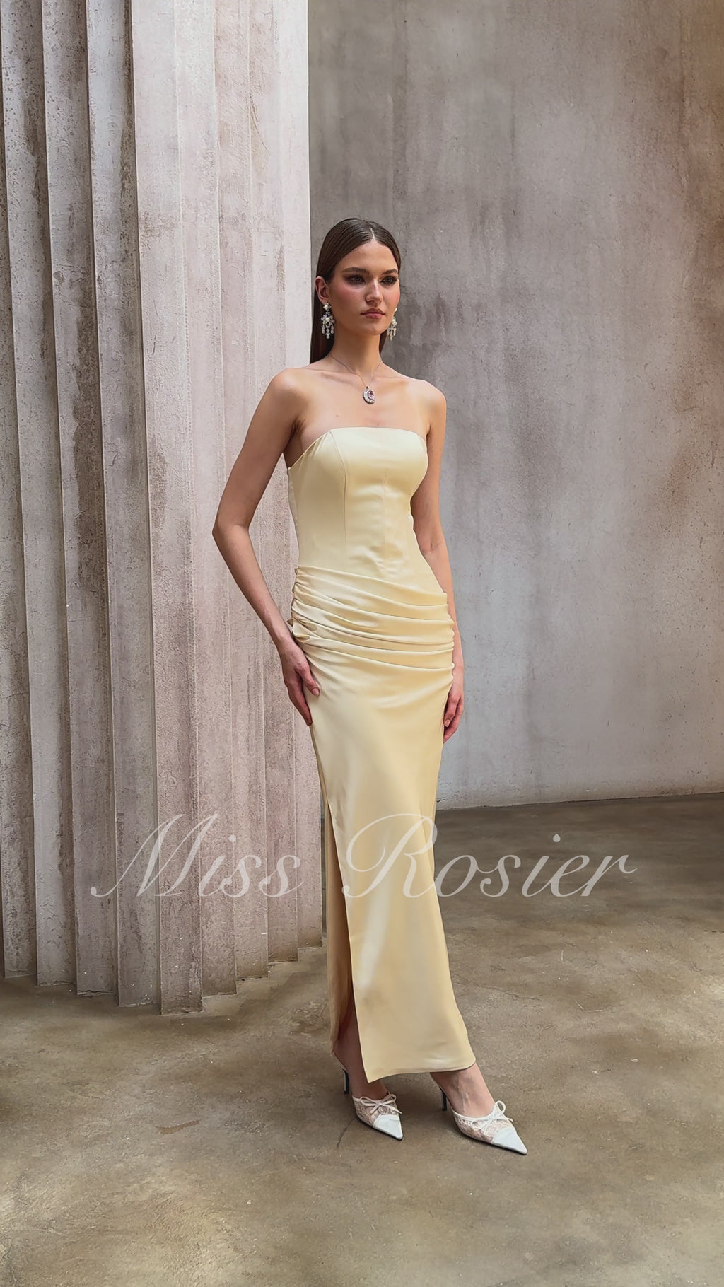 Adélade Gelbes gerafftes Satin-Korsett-Maxikleid