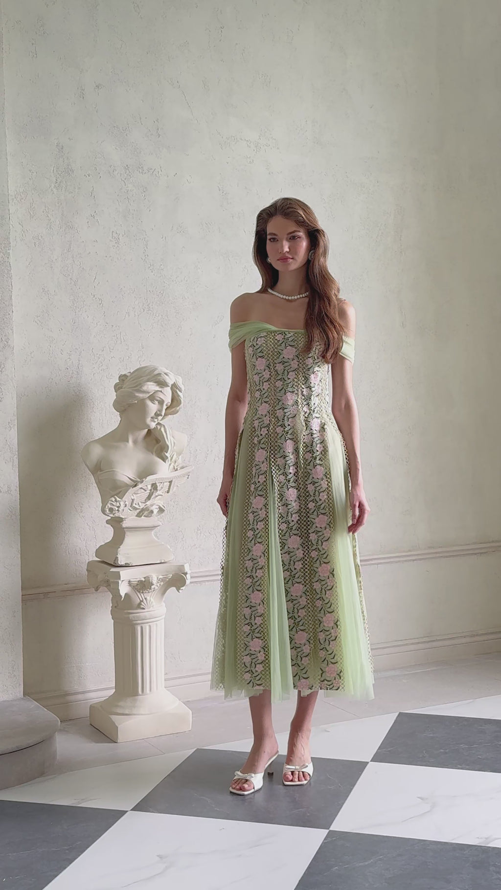 Eleni – Grünes Midikleid mit Tülleinsatz und Blumenmuster