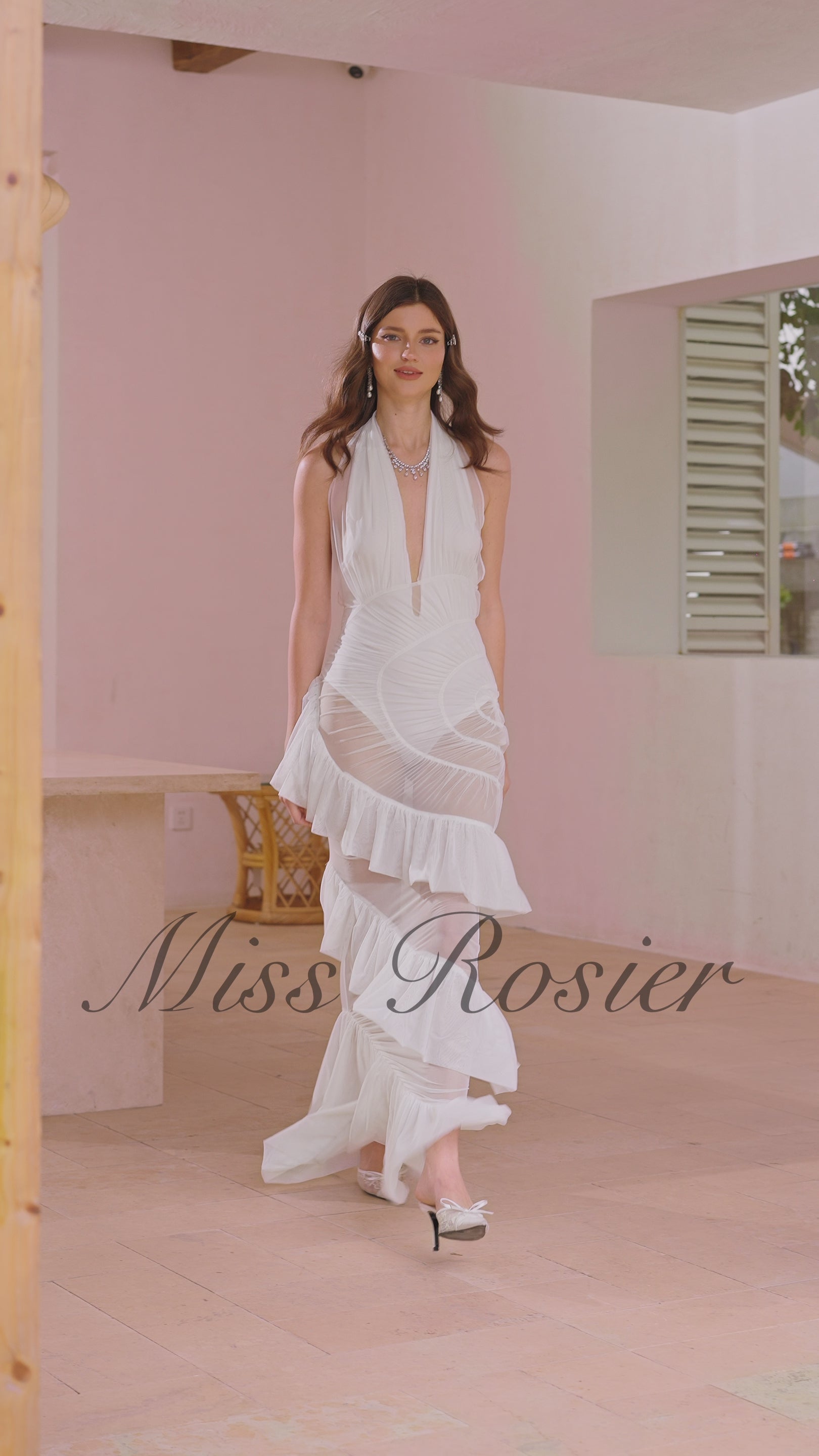 Winifred Weißes Neckholder-Maxikleid mit Raffungen und transparentem Stoff