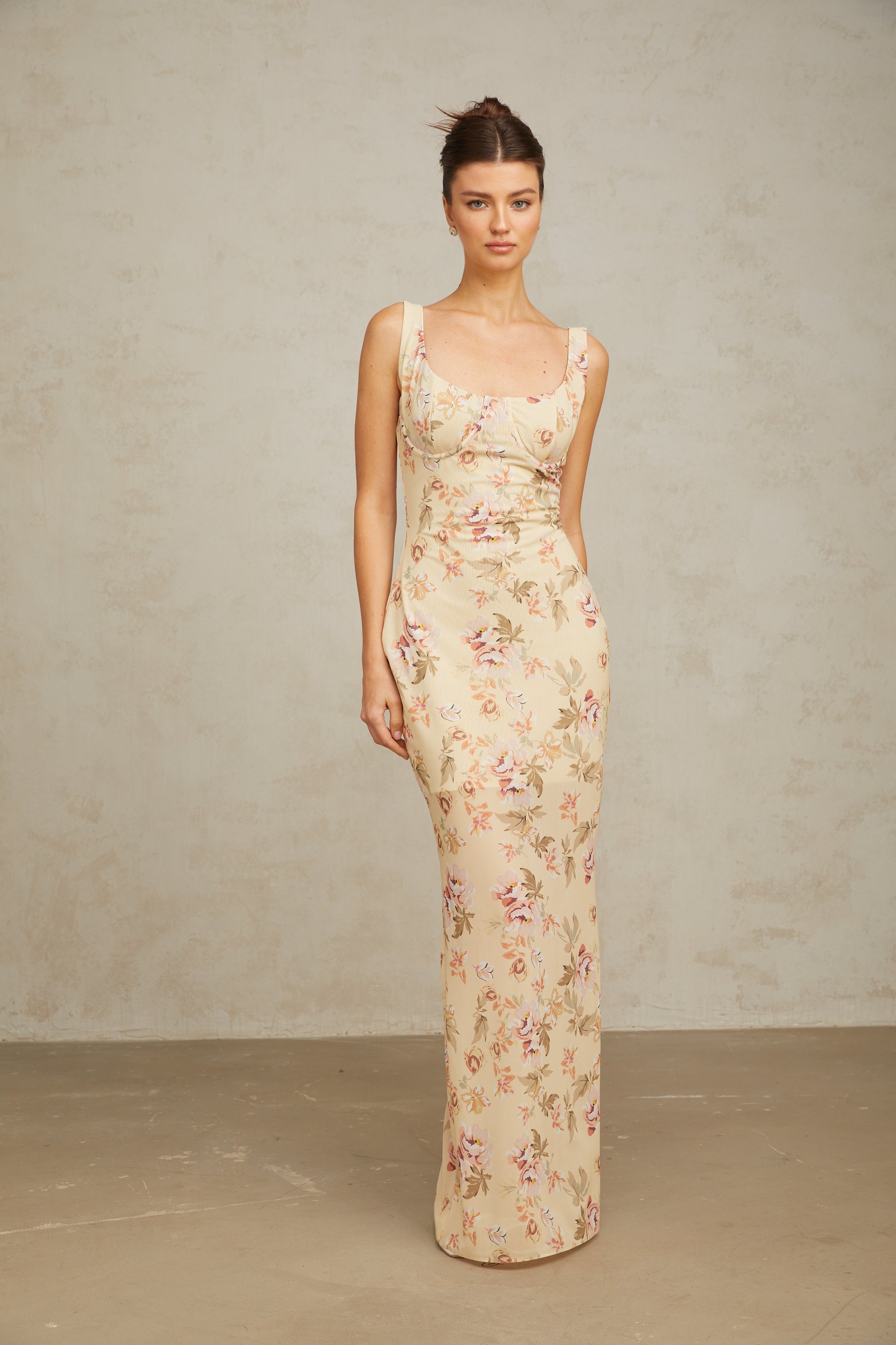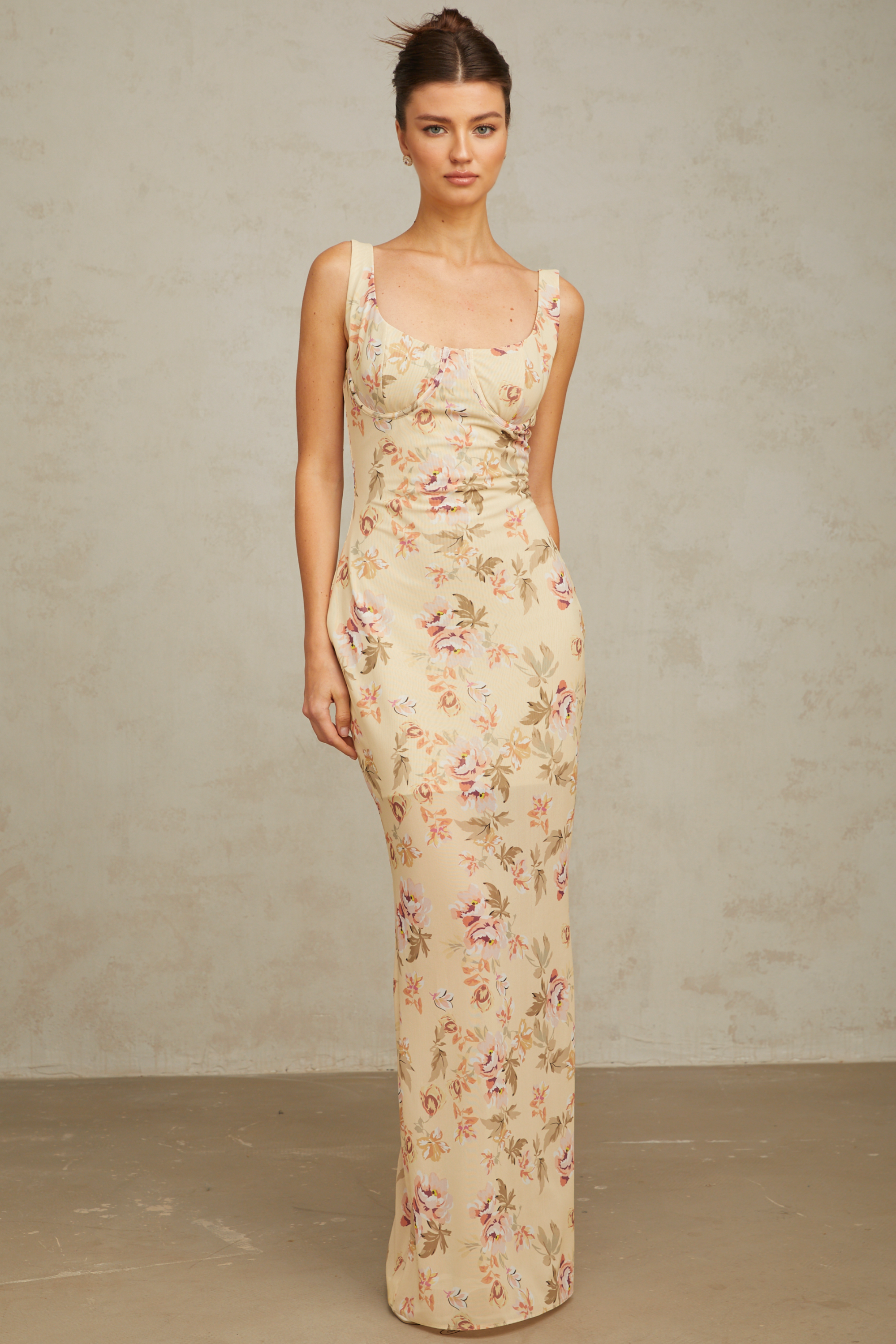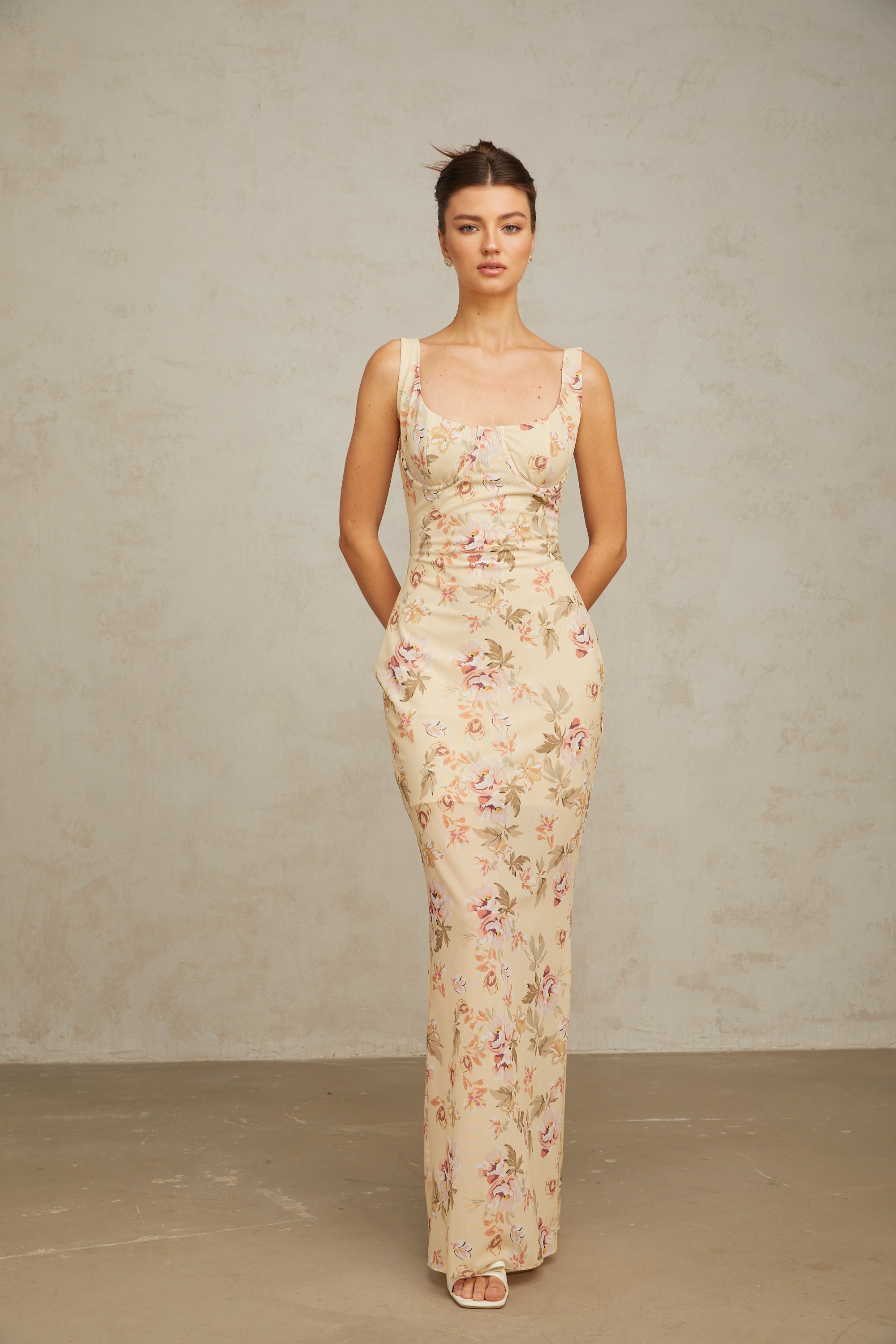 Alizée – Gelbes, ärmelloses Maxikleid mit Blumenmuster
