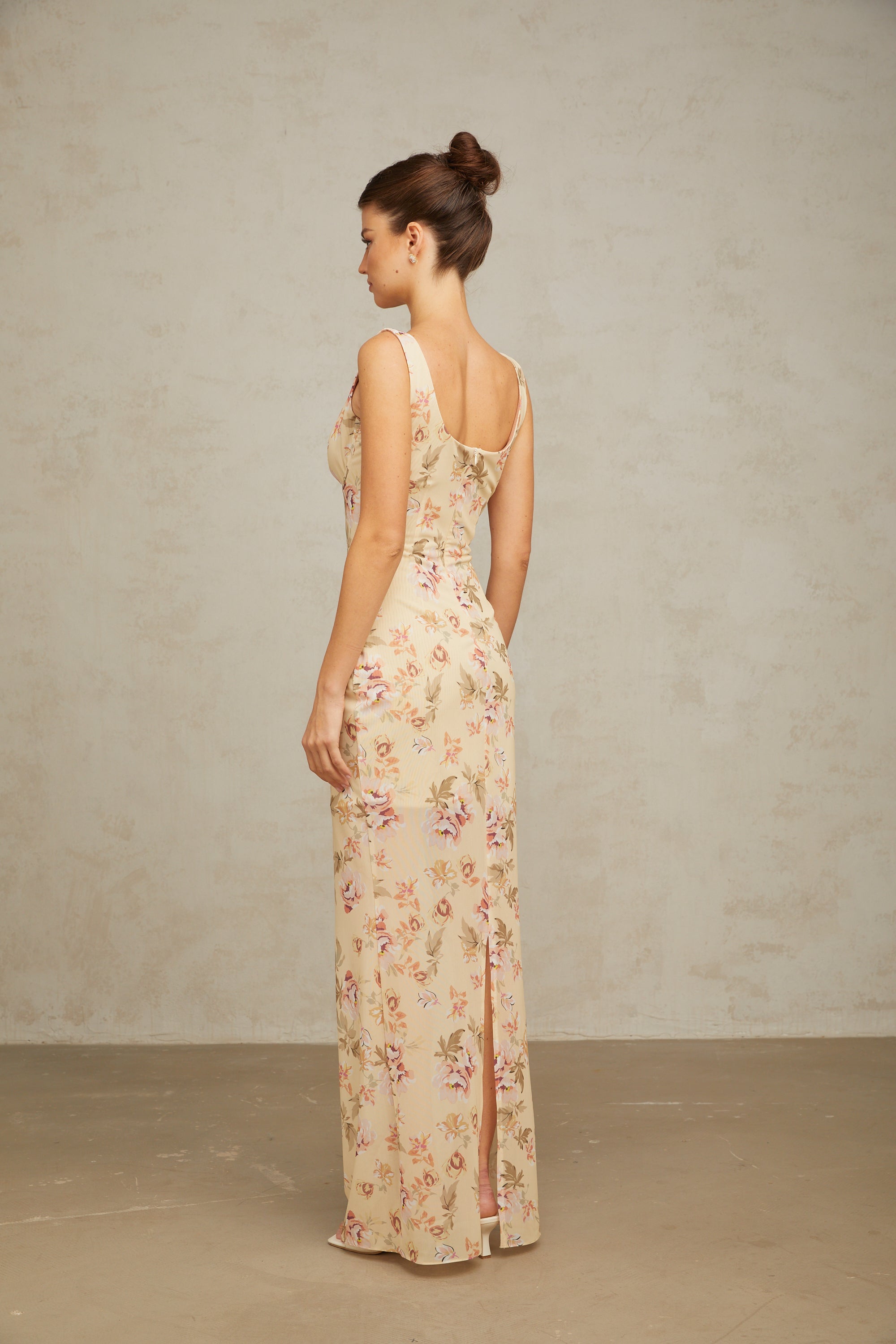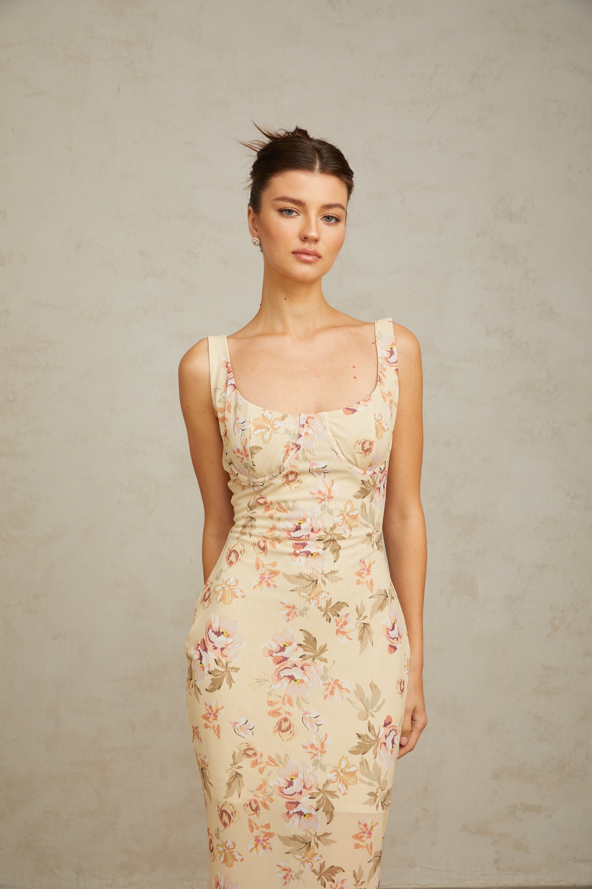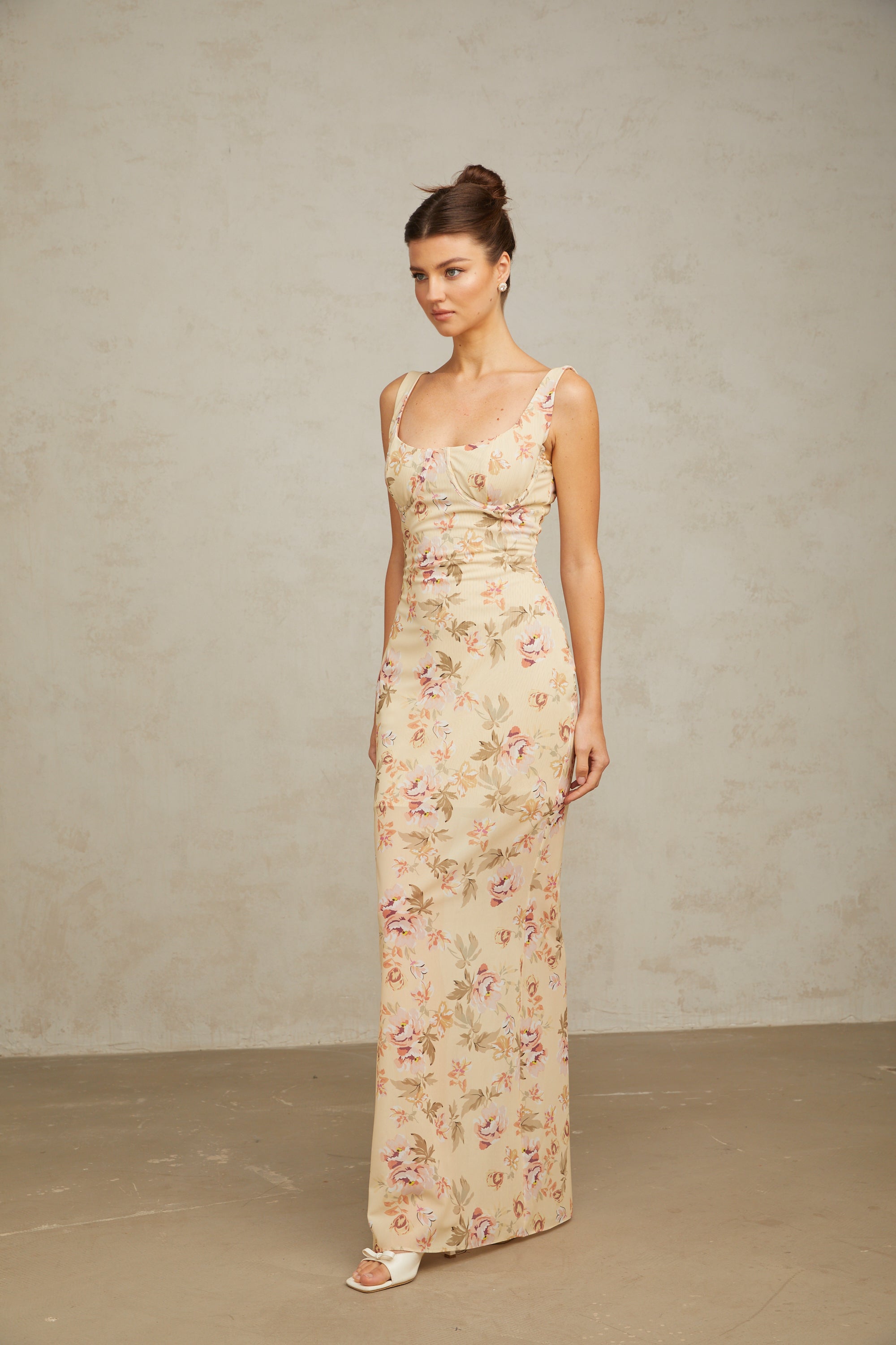 Alizée – Gelbes, ärmelloses Maxikleid mit Blumenmuster