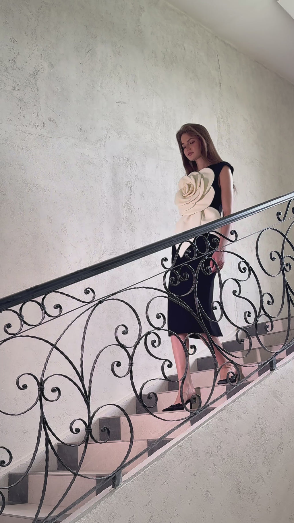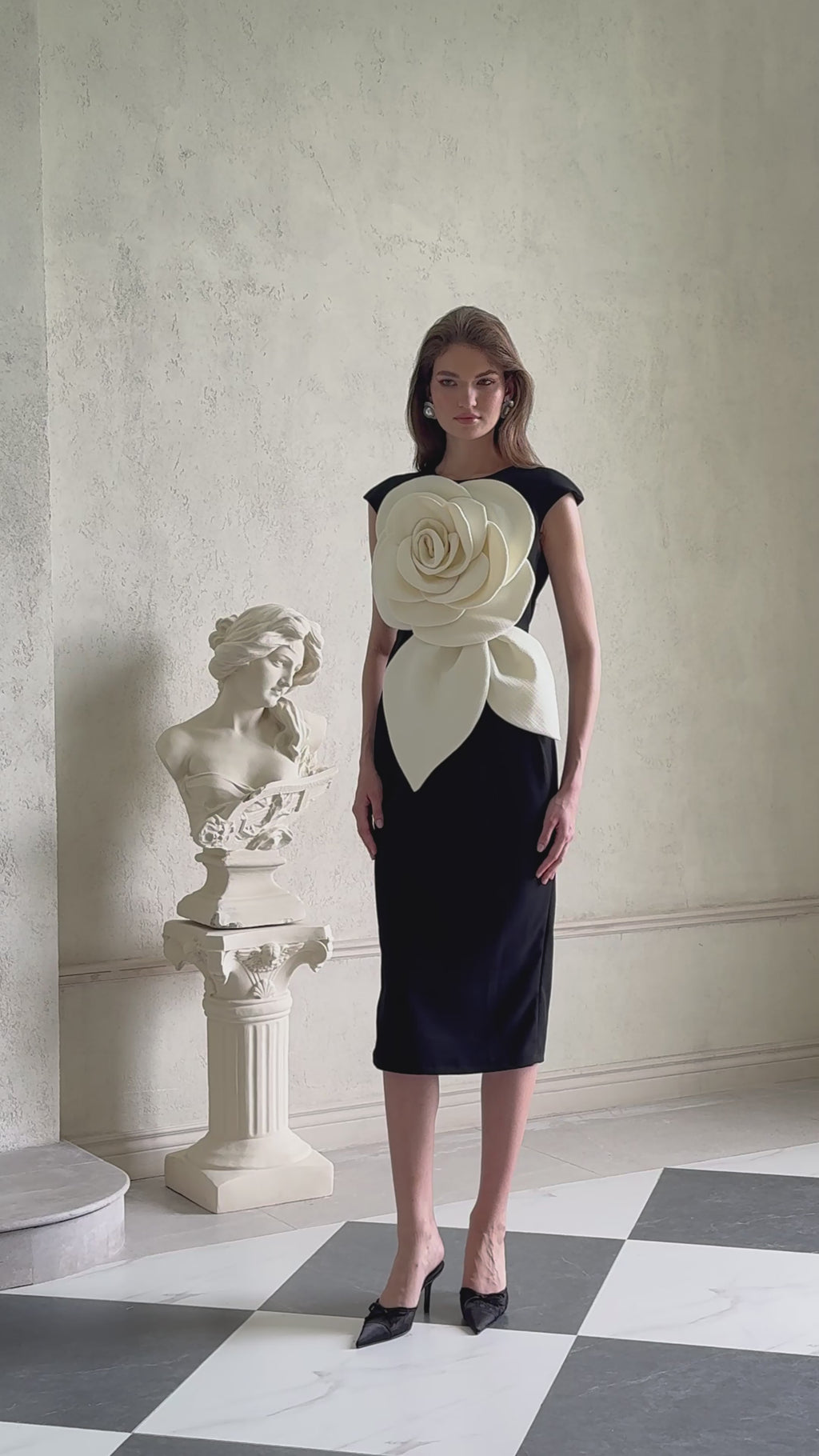 Aurélienne – Schwarzes Midi-Bleistiftkleid mit 3D-Blütenblättern