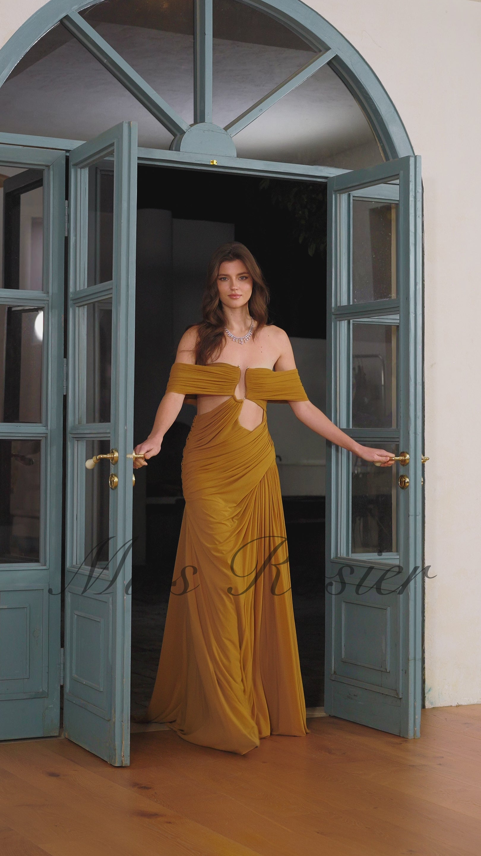Ludivine – Ockerfarbenes, schulterfreies, gerüschtes Maxikleid mit Cut-outs