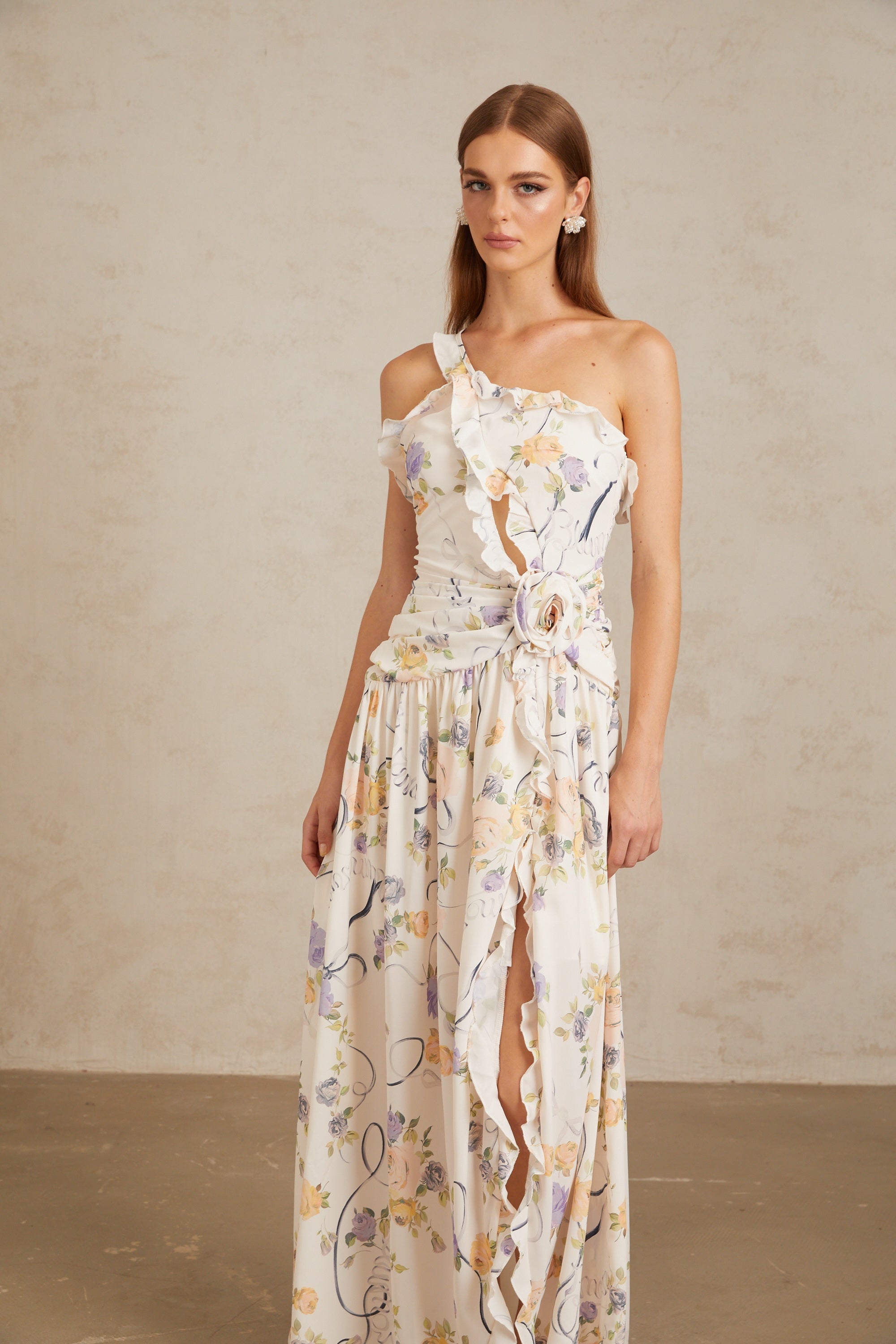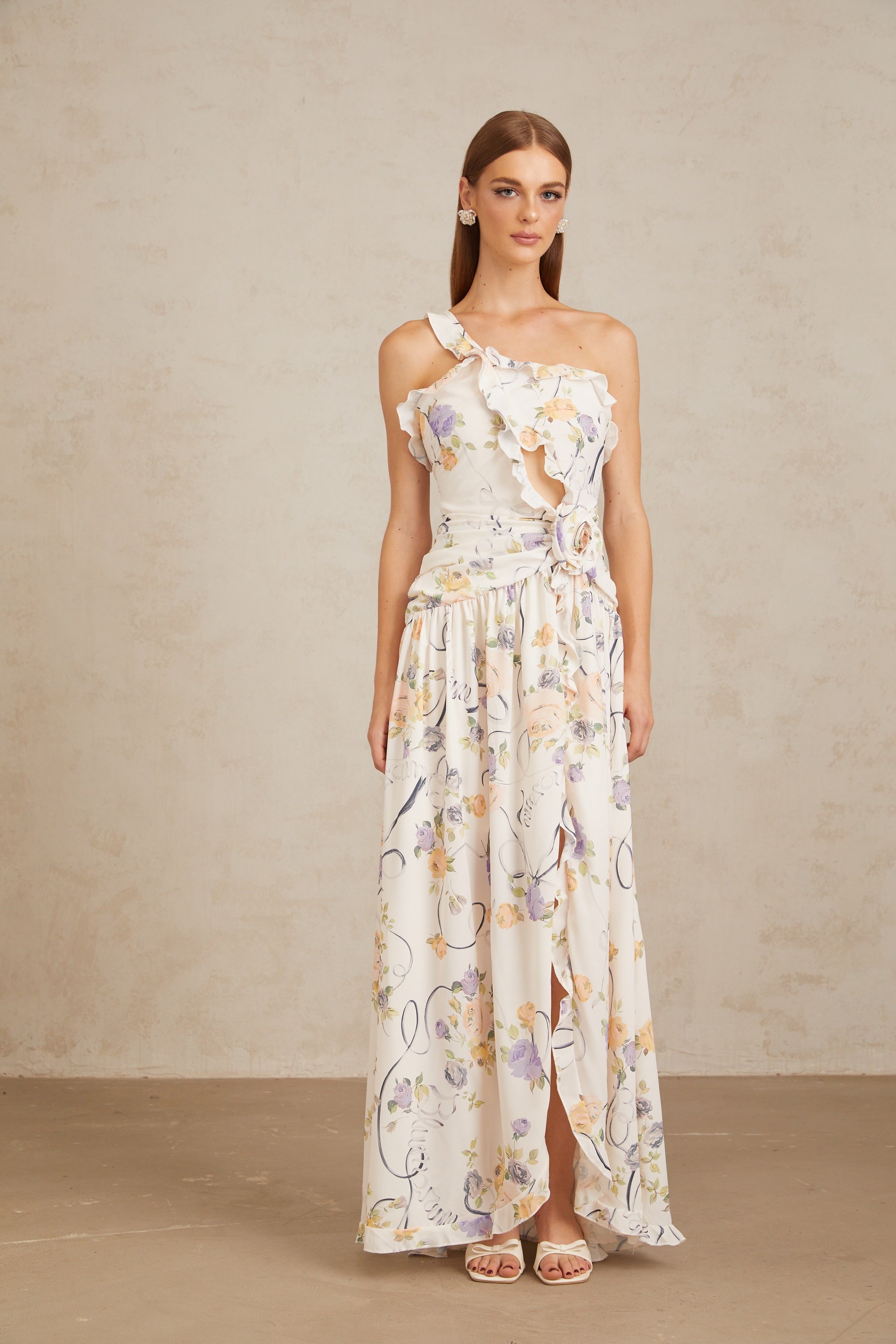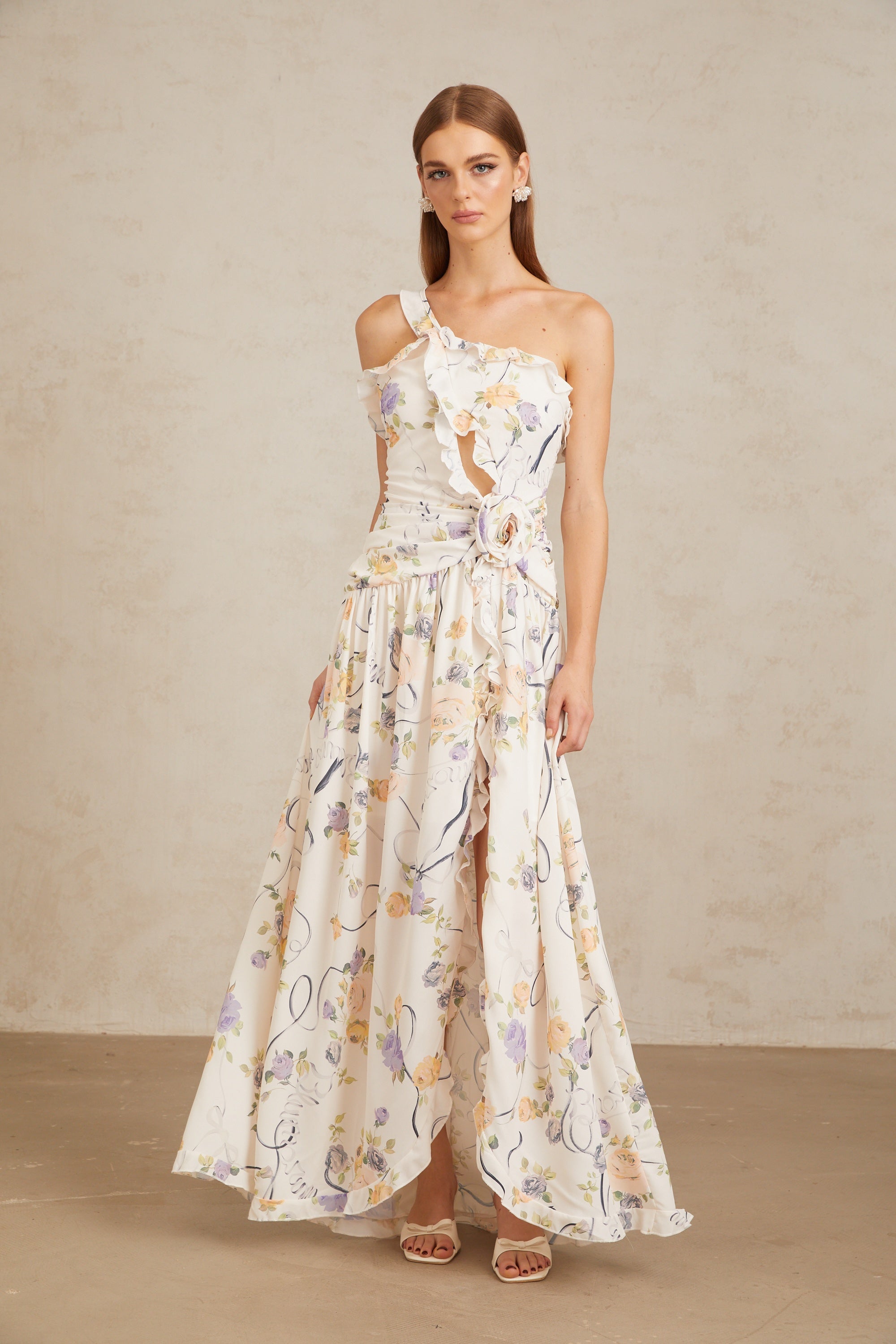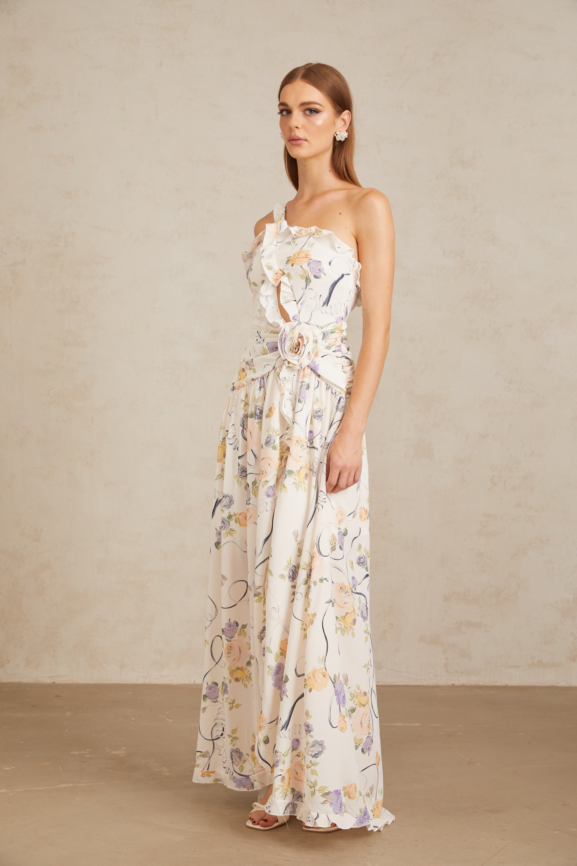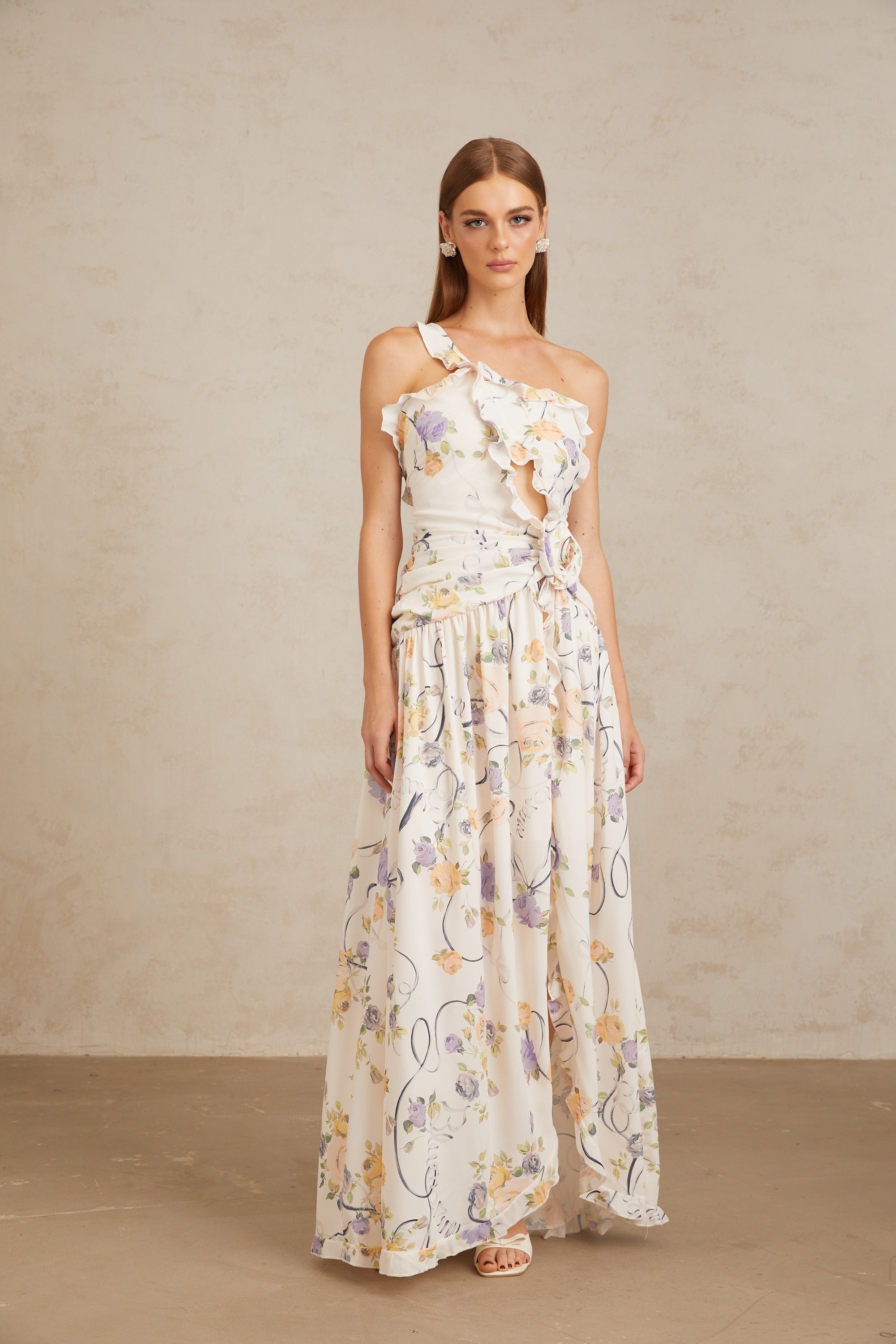 Noémie Neutral Floral Ruffled Trim Maxi Dress