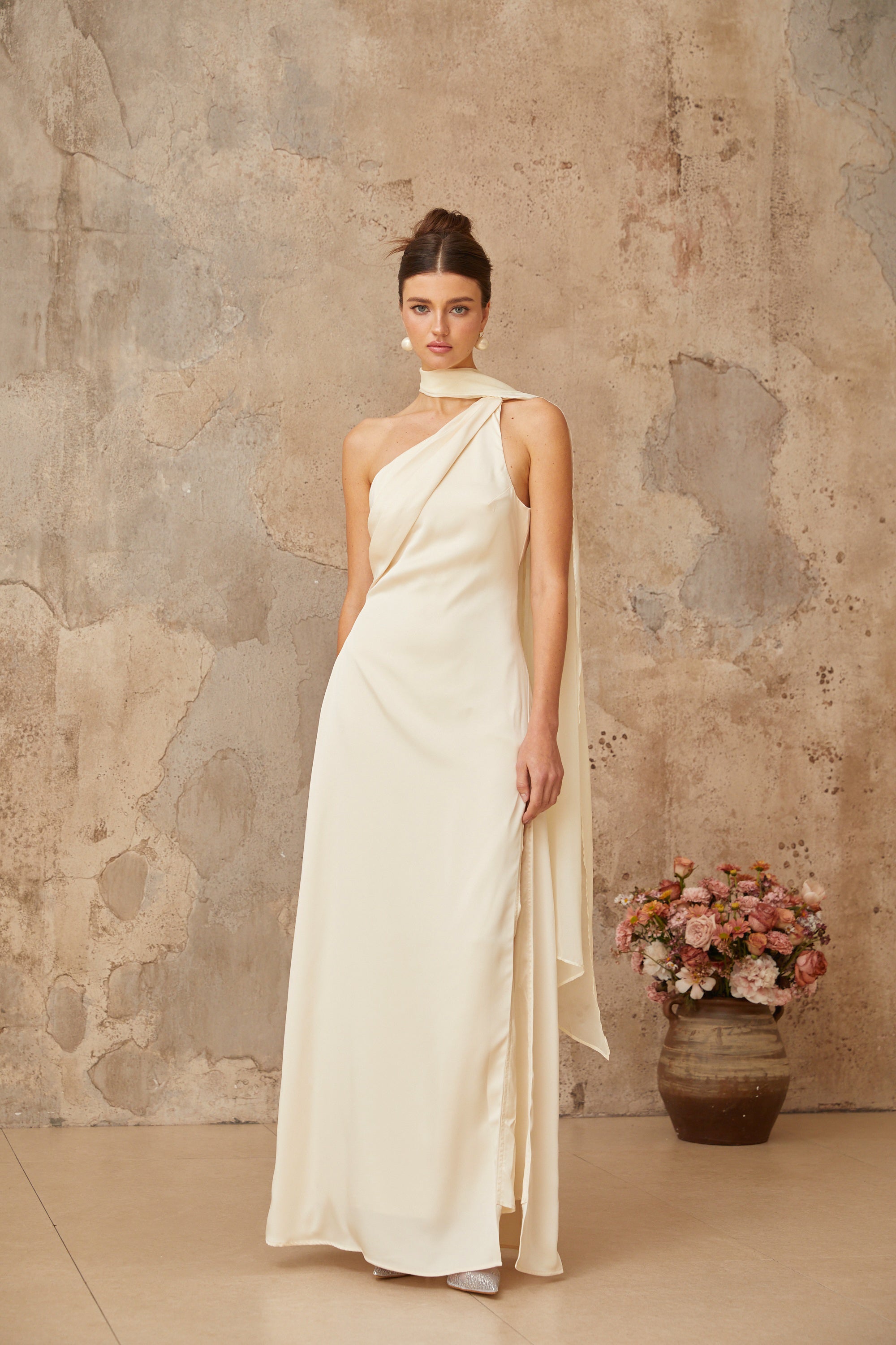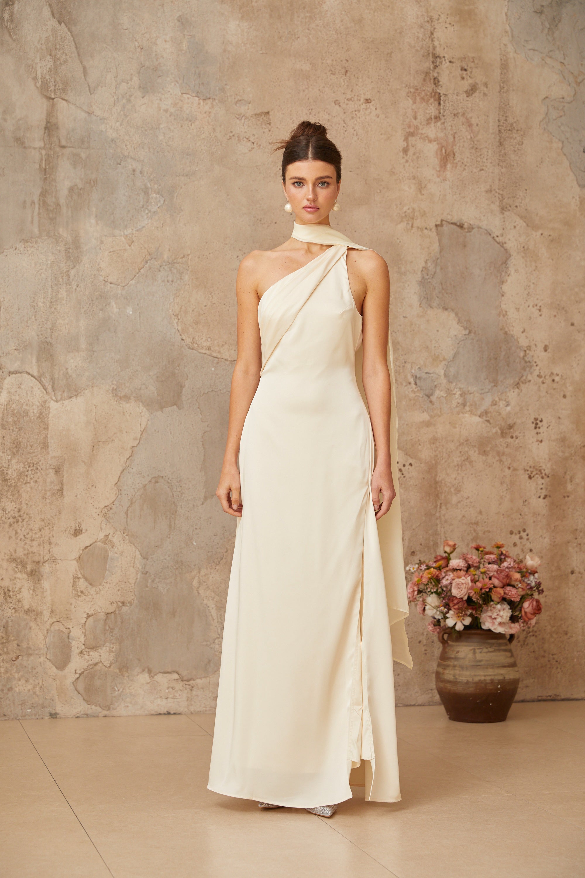 Thérèse neutral scarf-design satin maxi dress