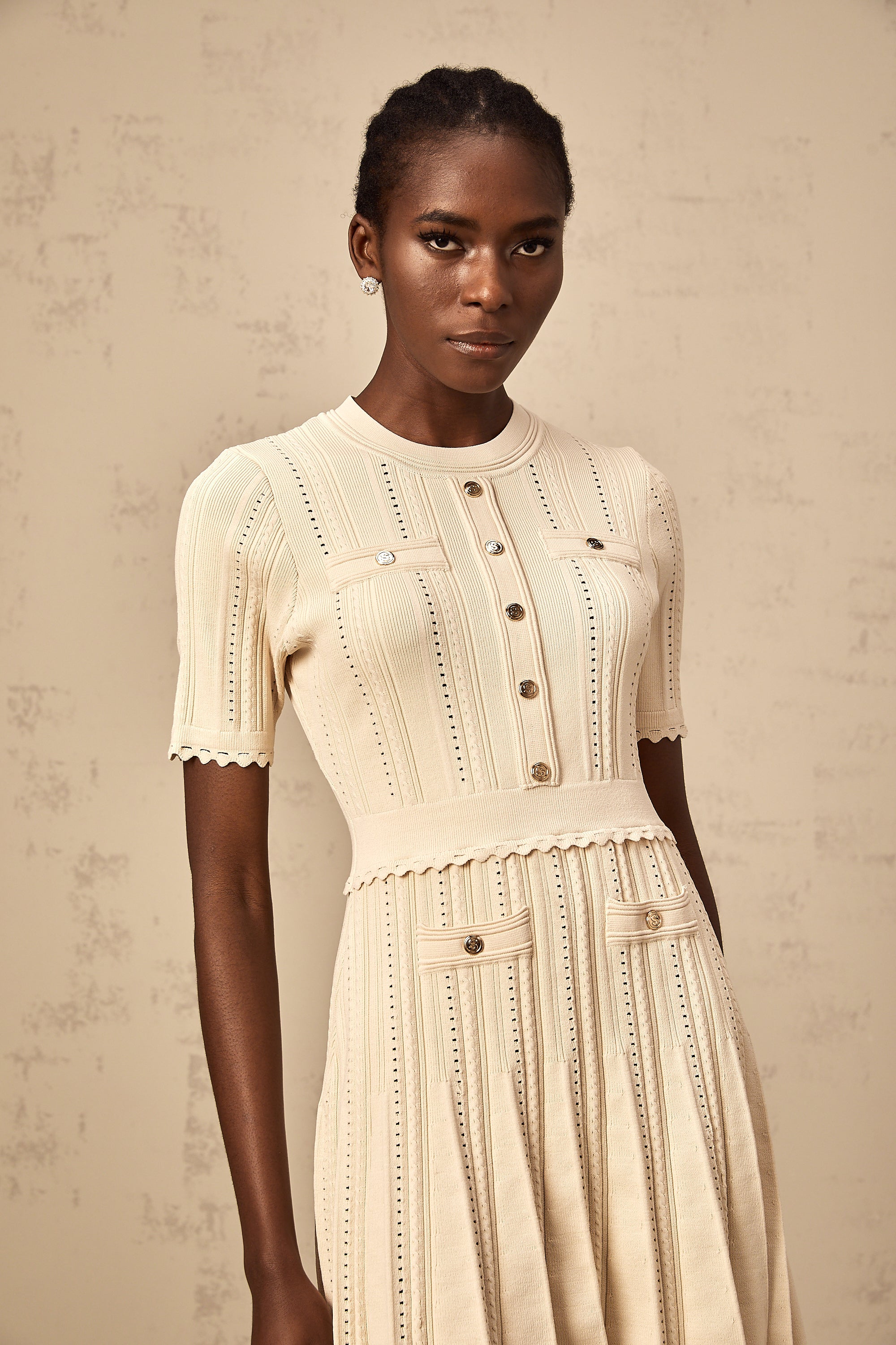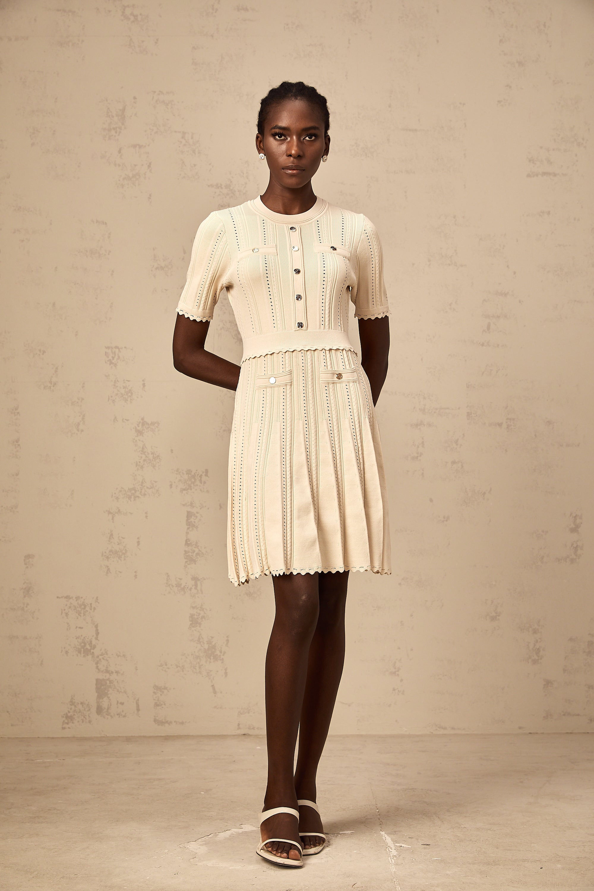 Amélie neutrals pointelle-trim pleated knit mini dress