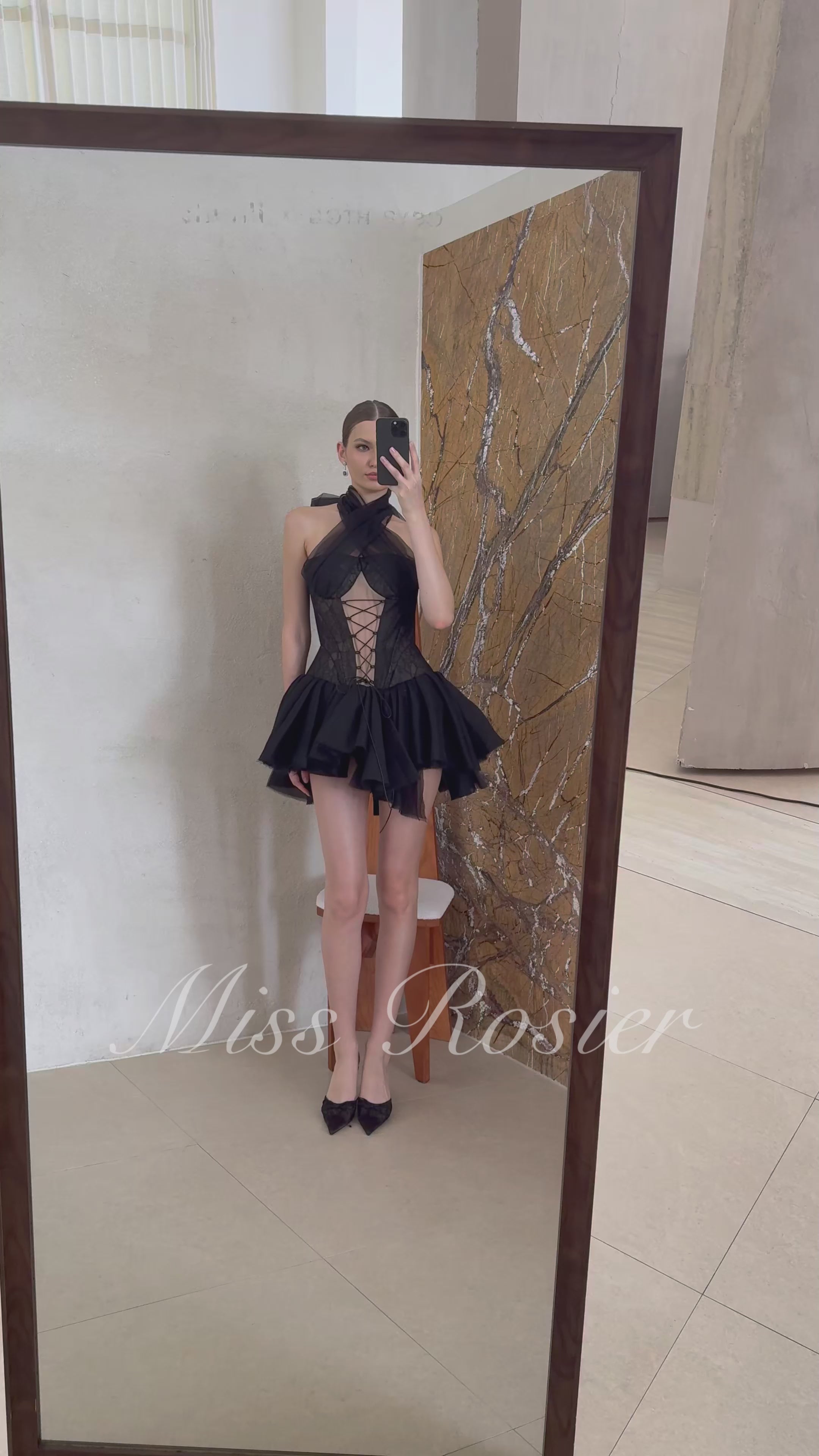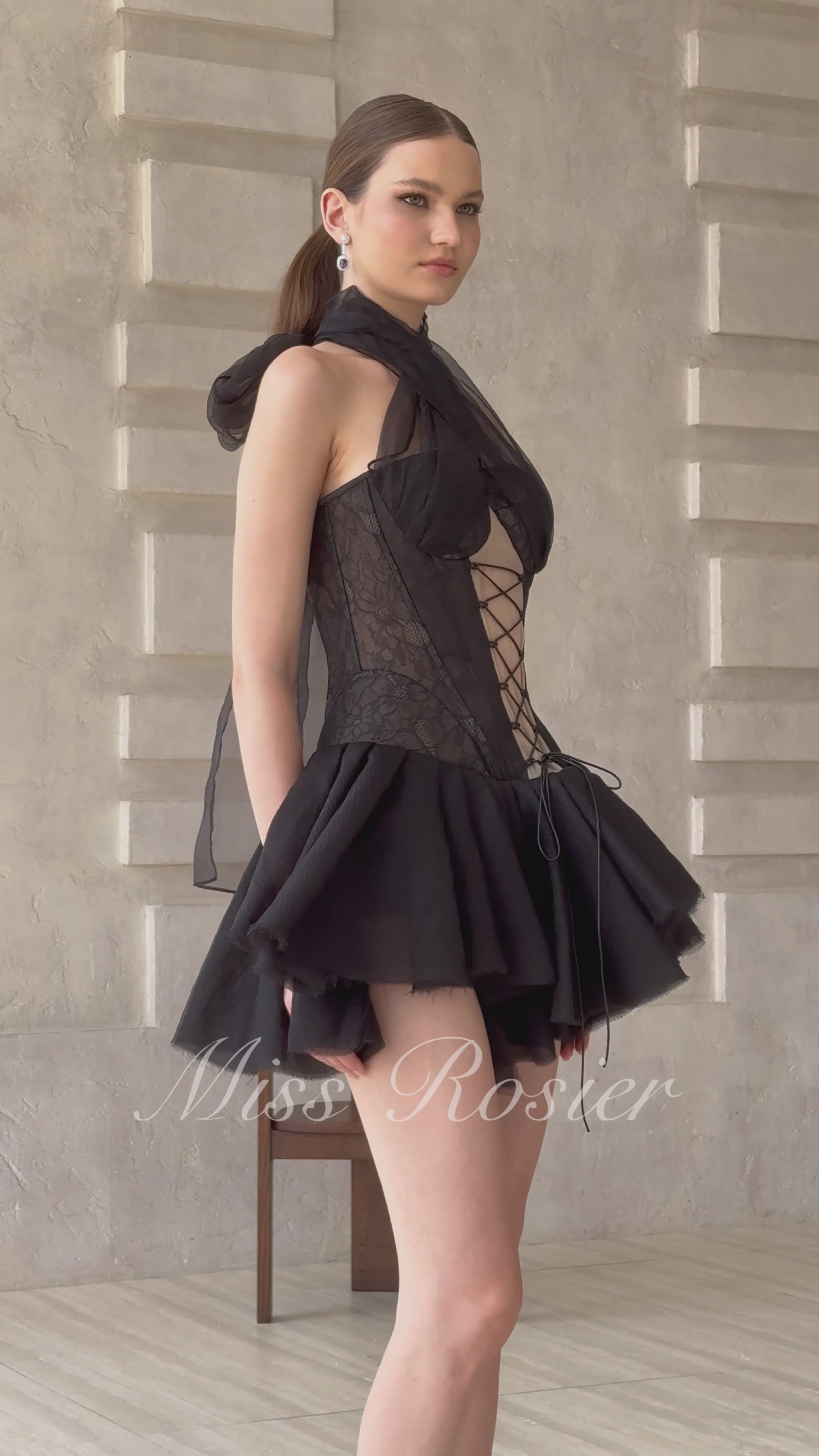 Pénélope Black Halterneck Lace Panel Mini Dress