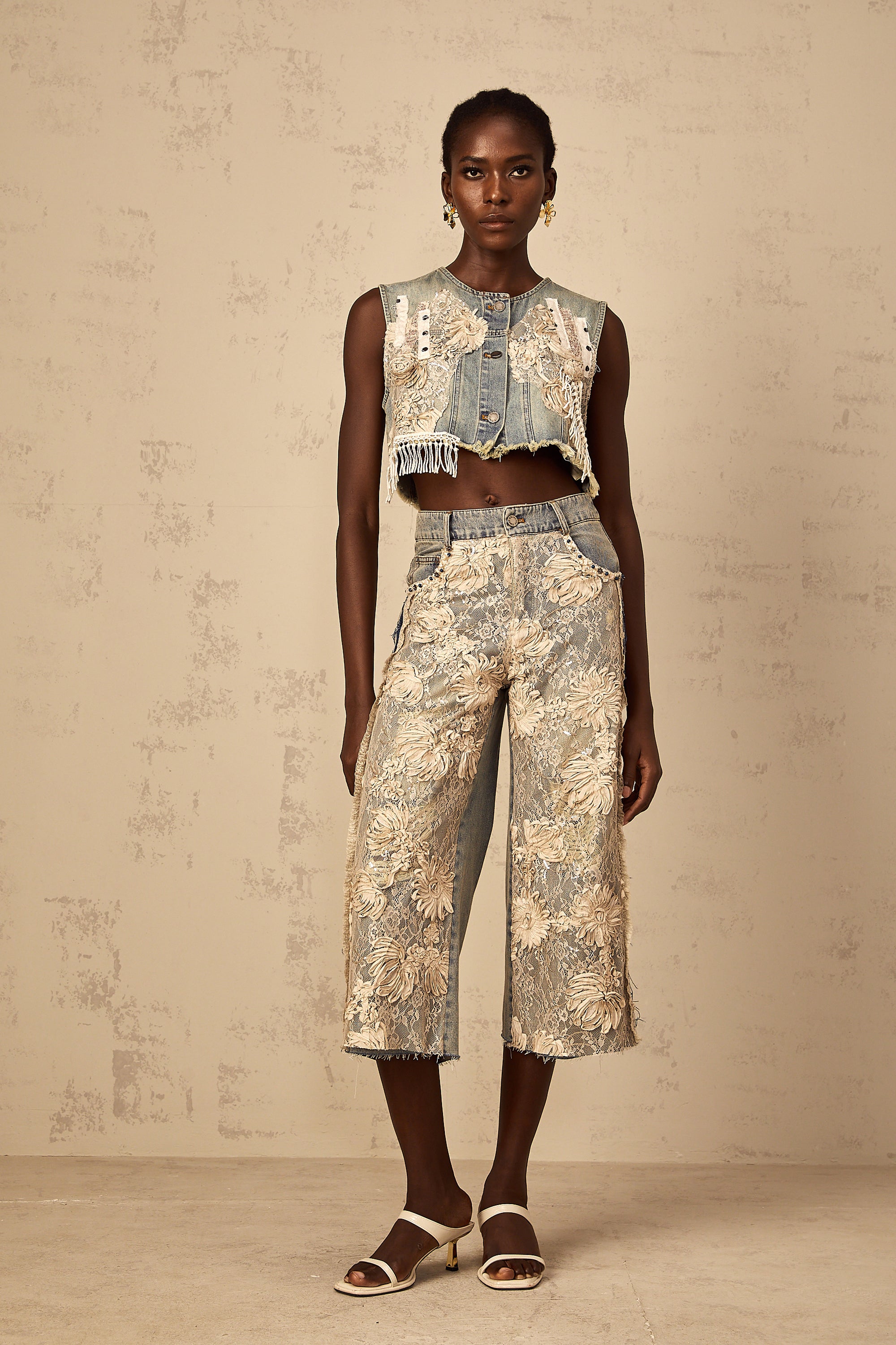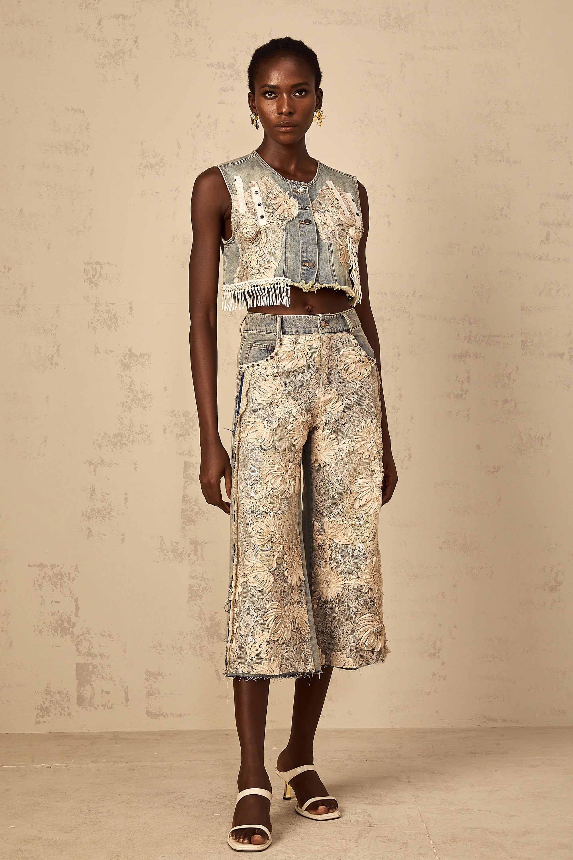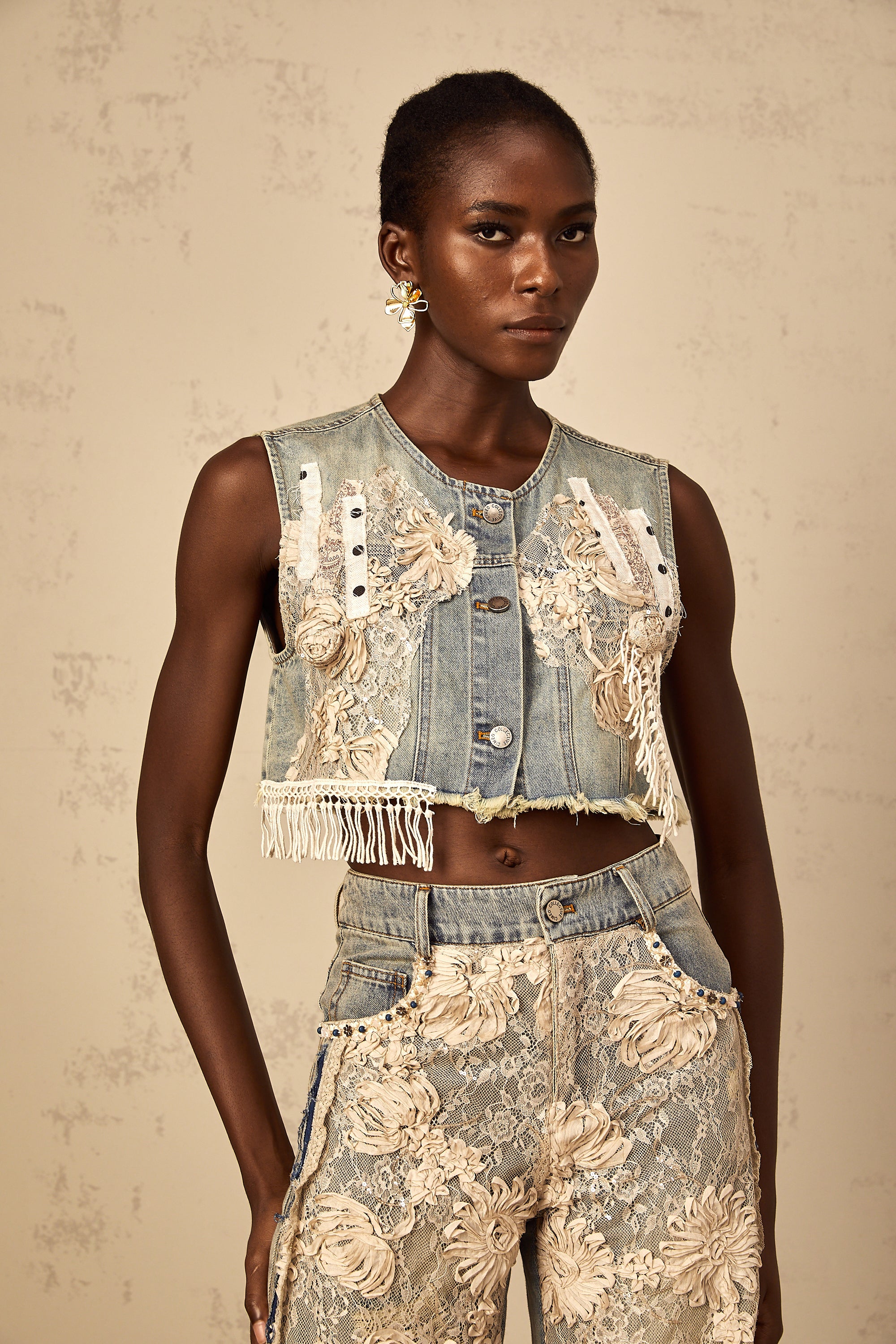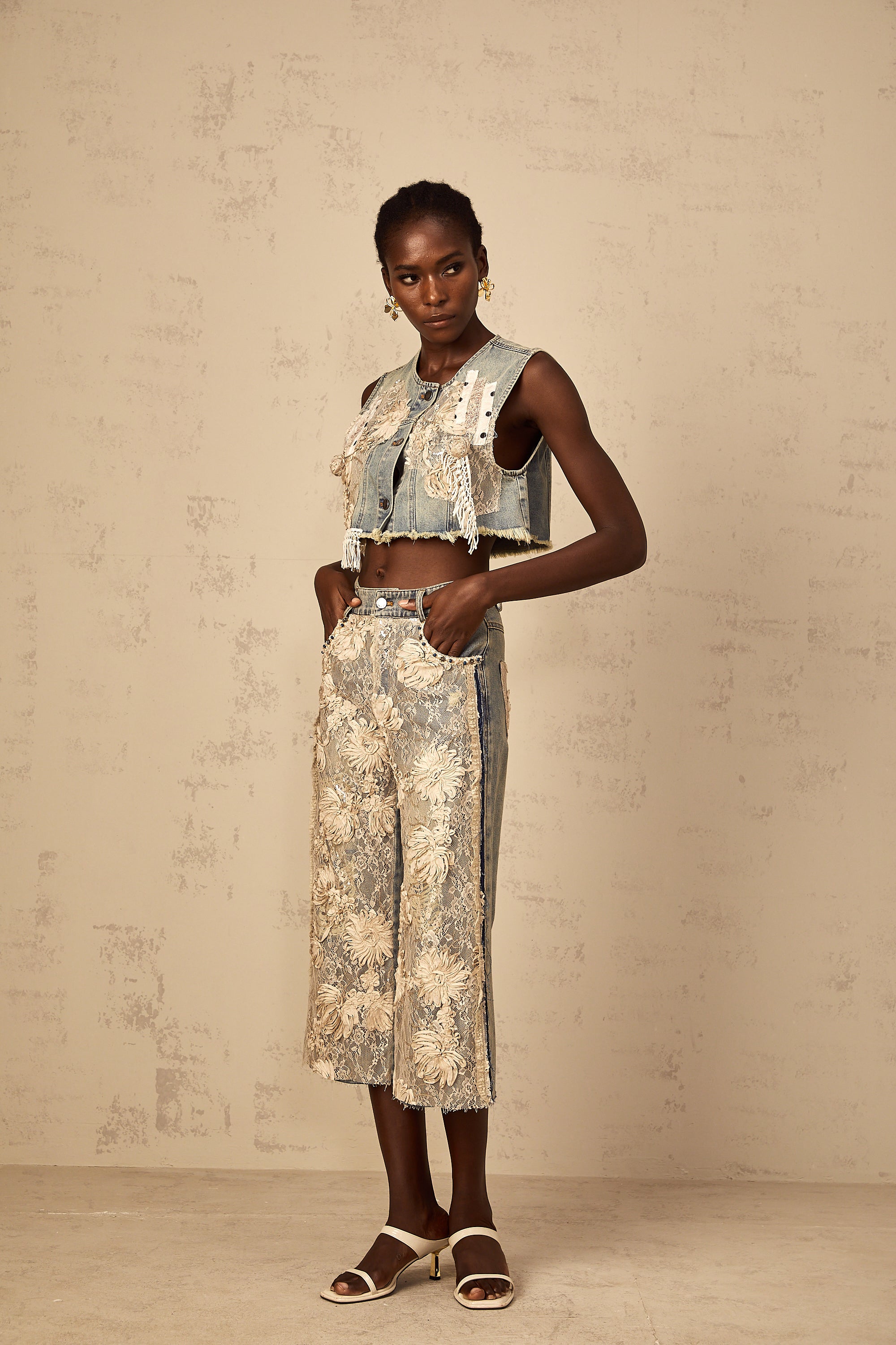Amaryllis blue lace-panelling cropped denim top
