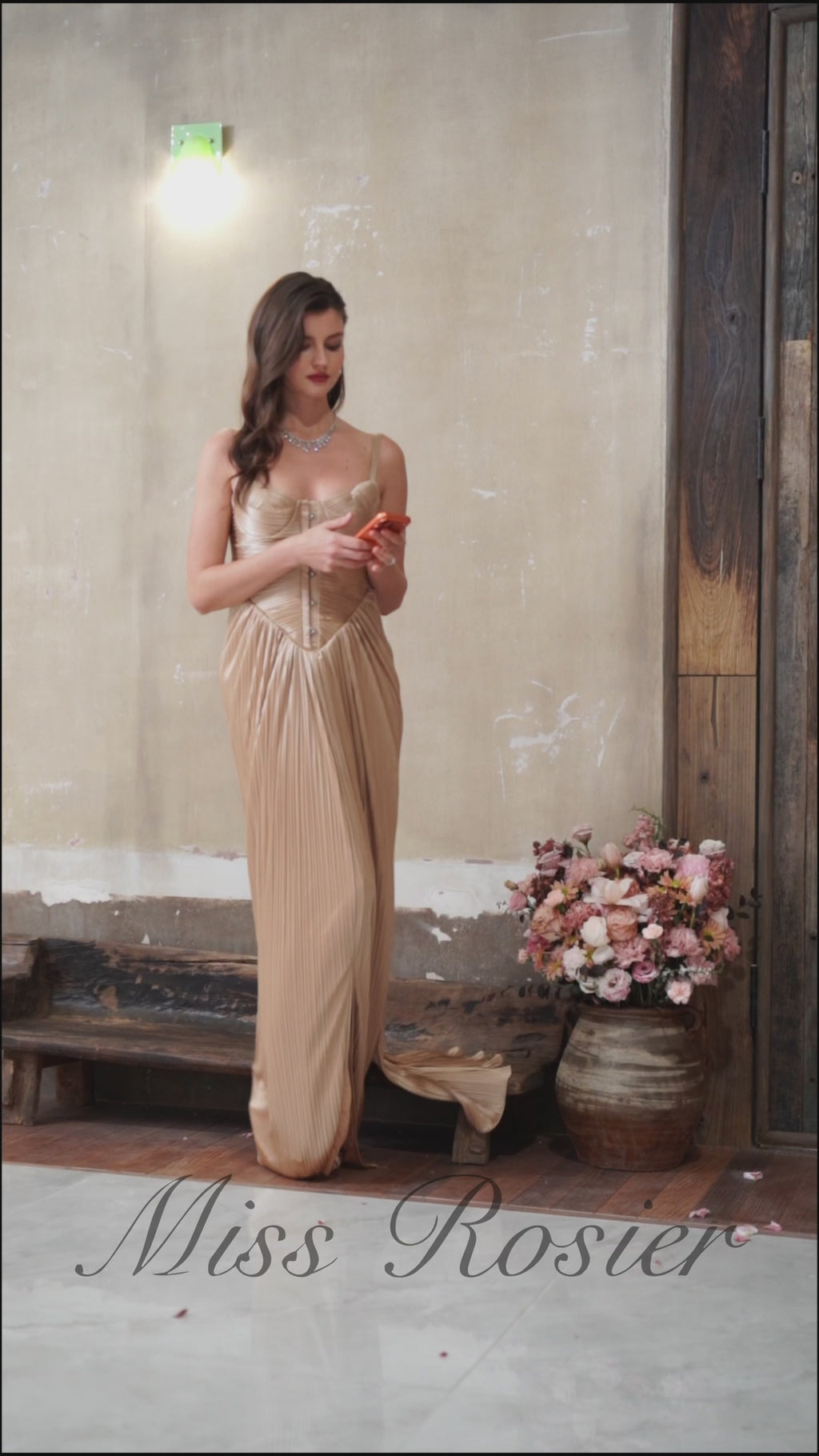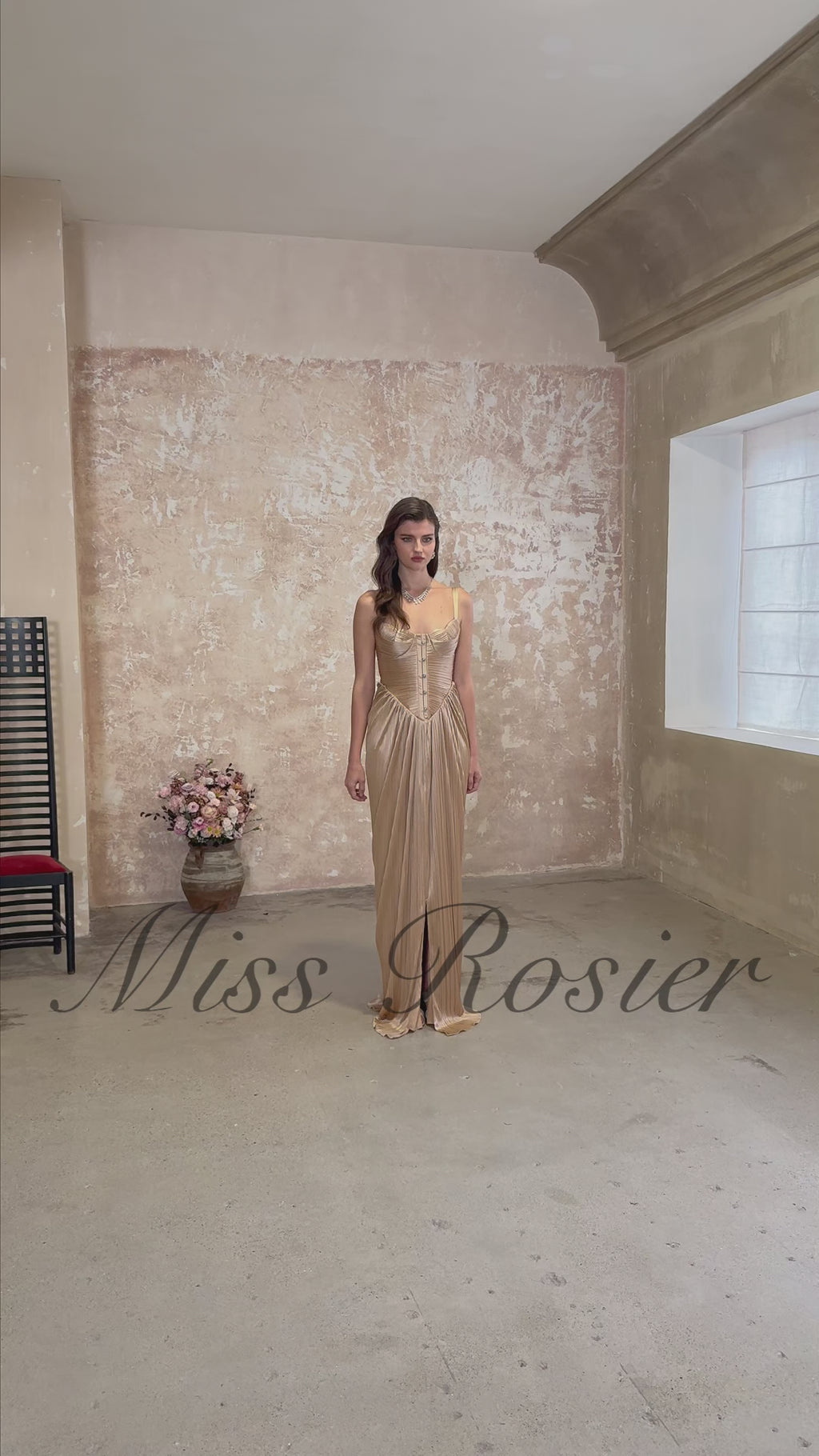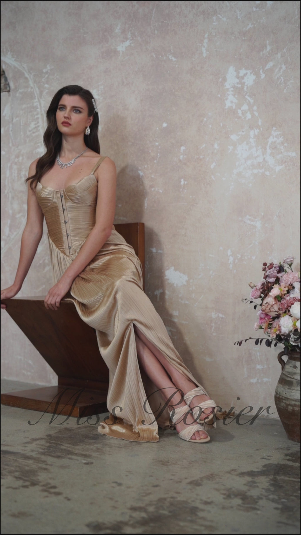 Nicoletta Gold Glossy Pleated Corset Maxi Dress